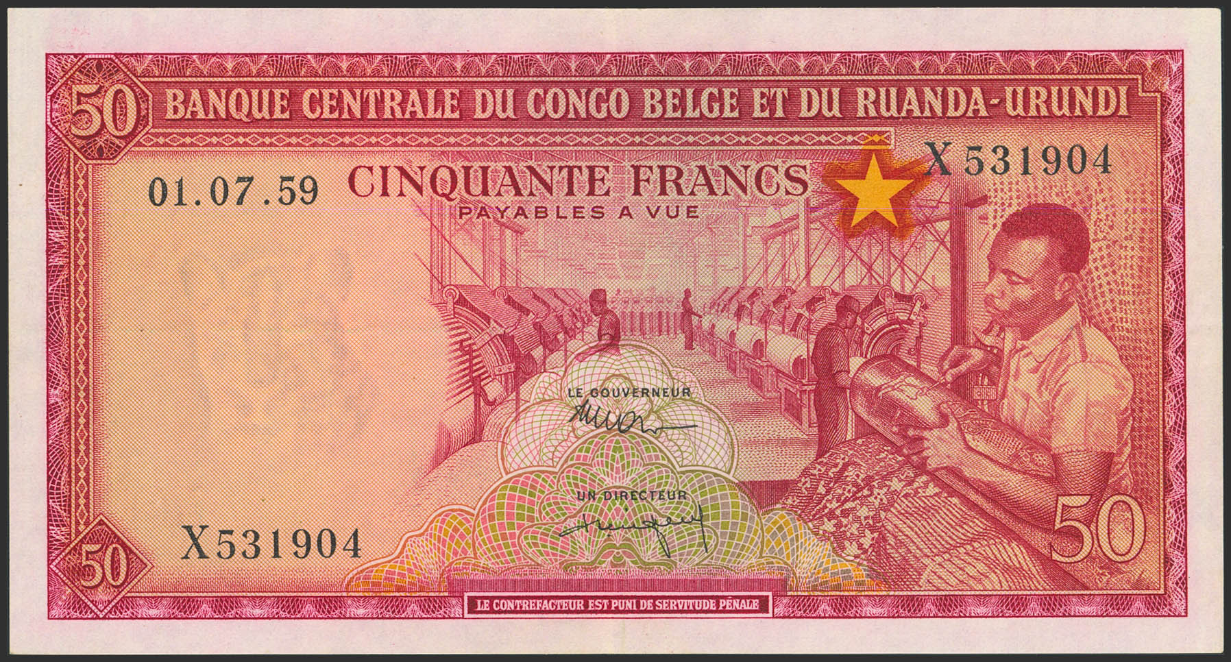 BELGIAN CONGO. 50 Francs. 1 July 1959. Banque Centrale du Congo Belge et du Ruanda-Urundi. (Pick: 32). Extremely Fine.