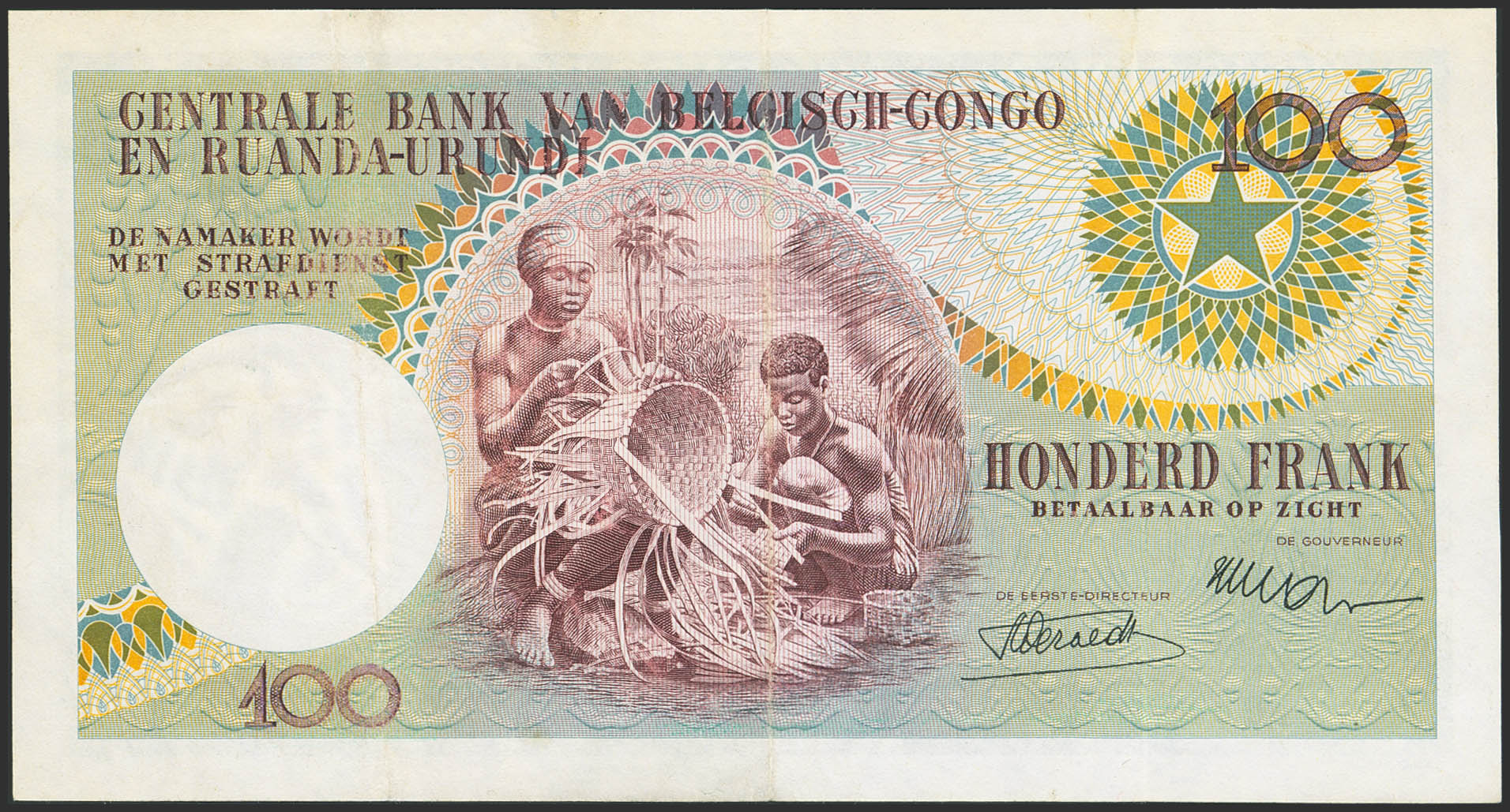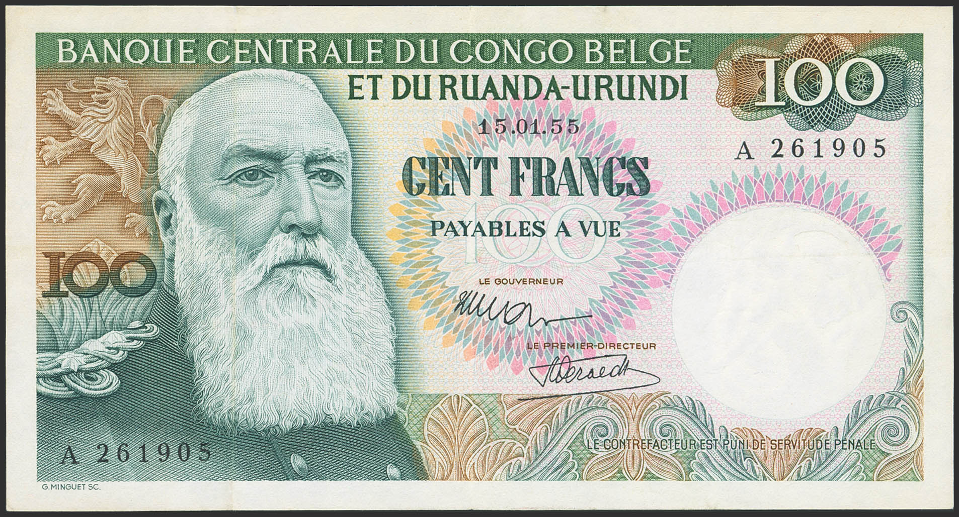 BELGIAN CONGO. 100 Francs. 15 January 1955. Banque Centrale du Congo Belge et du Ruanda-Urundi. (Pick: 33a). Washed and flattened. More than Very Fine.