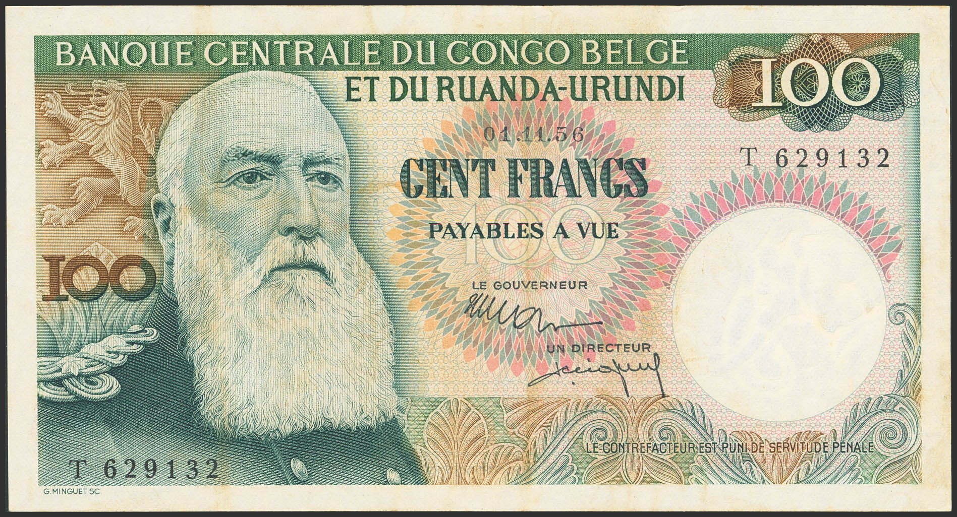 English BELGIAN CONGO. 100 Francs. 1 November 1956. Banque Centrale du Congo Belge et du Ruanda-Urundi. (Pick: 33b). Extremely Fine.
