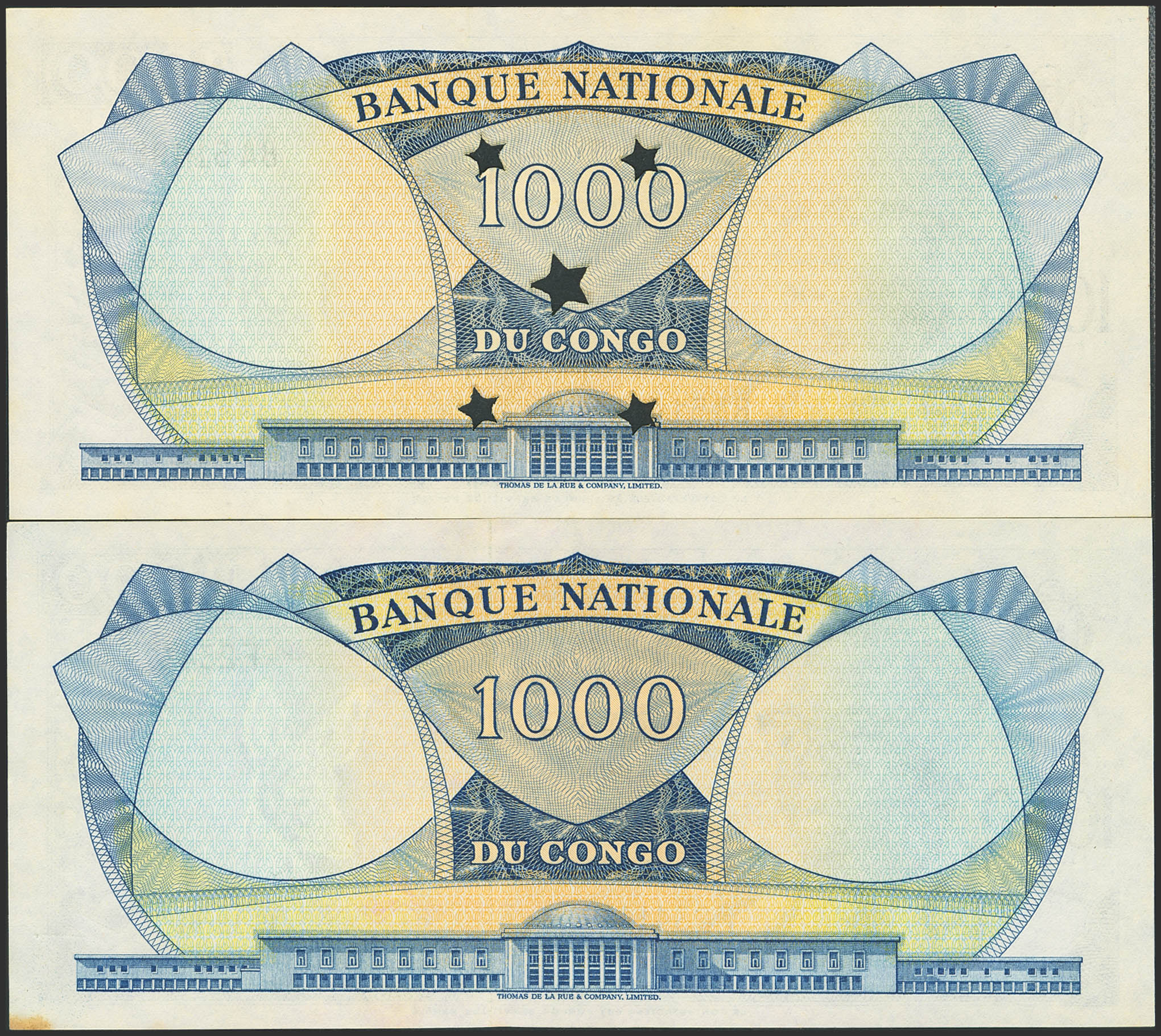 CONGO DEMOCRATIC REPUBLIC. Lot of 2 notes of 1000 Francs. 15 December 1961 and 1 August 1964. Banque Nationale. (Pick: 8a, 8b). One of them has a stain on the lower edge, and the other punch hole cancelled. Uncirculated.