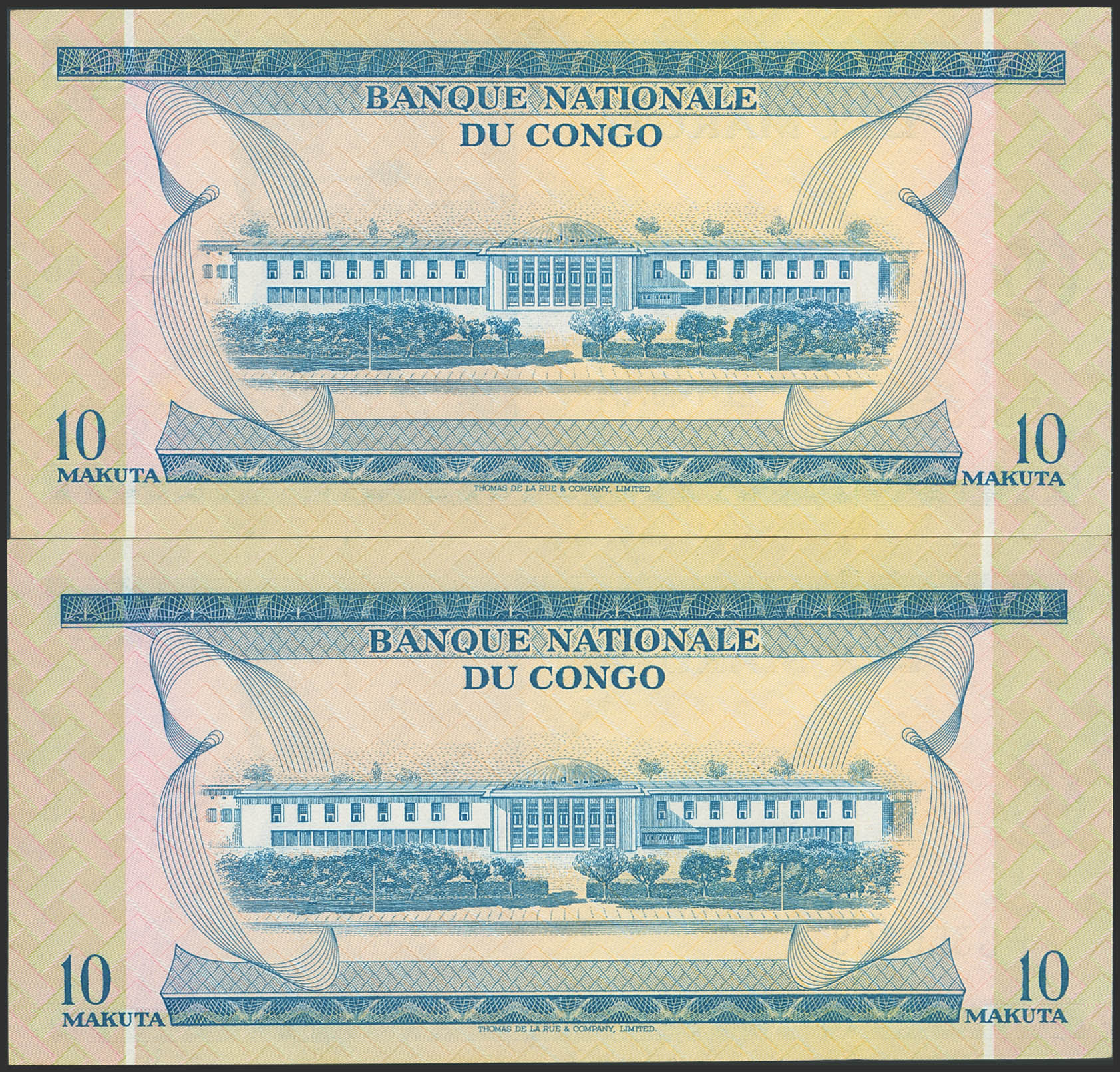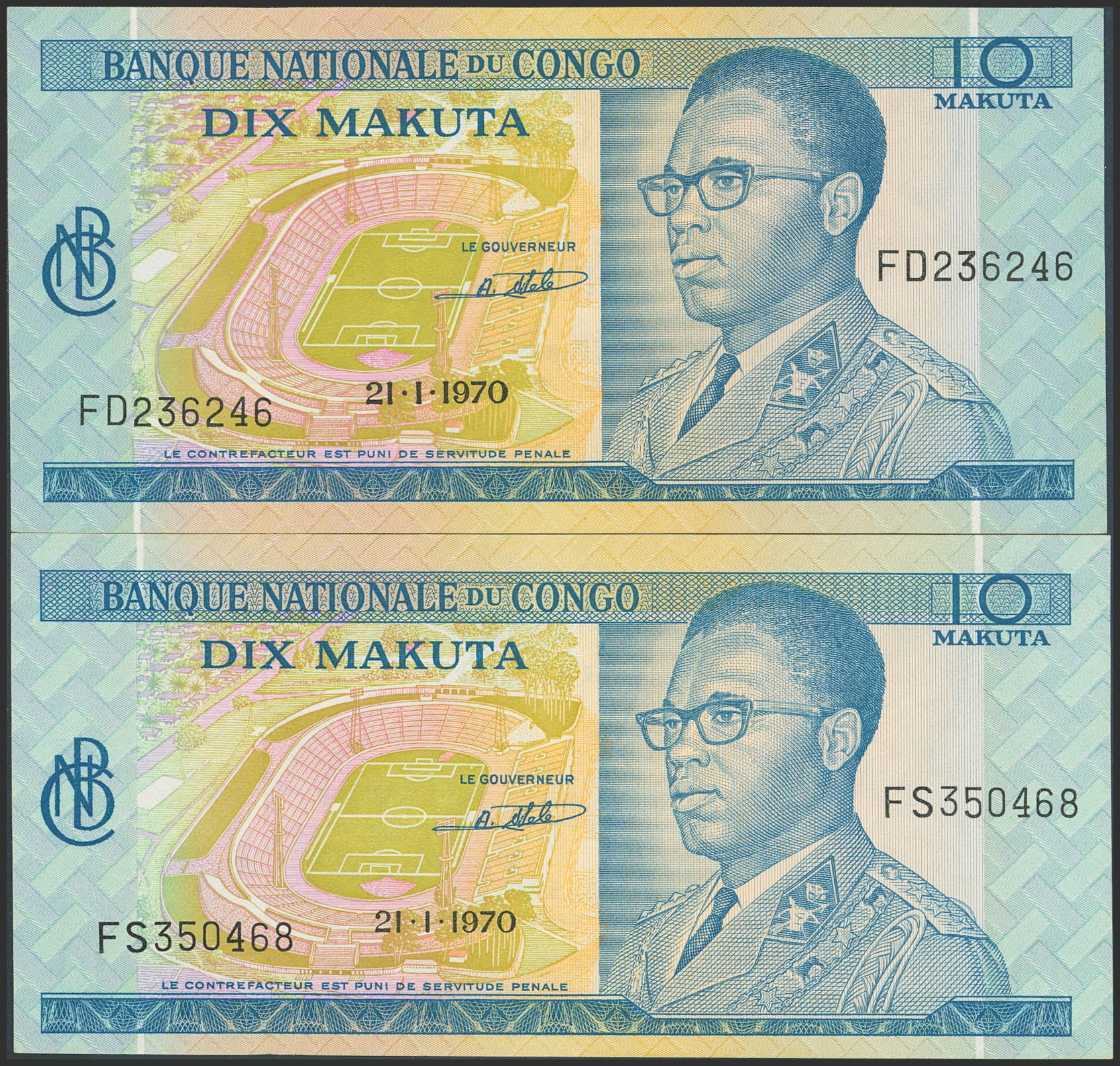 CONGO DEMOCRATIC REPUBLIC. Lot of 2 notes of 10 Makuta. 21 January 1970. Banque Nationale. (Pick: 9a). More than Extremely Fine.