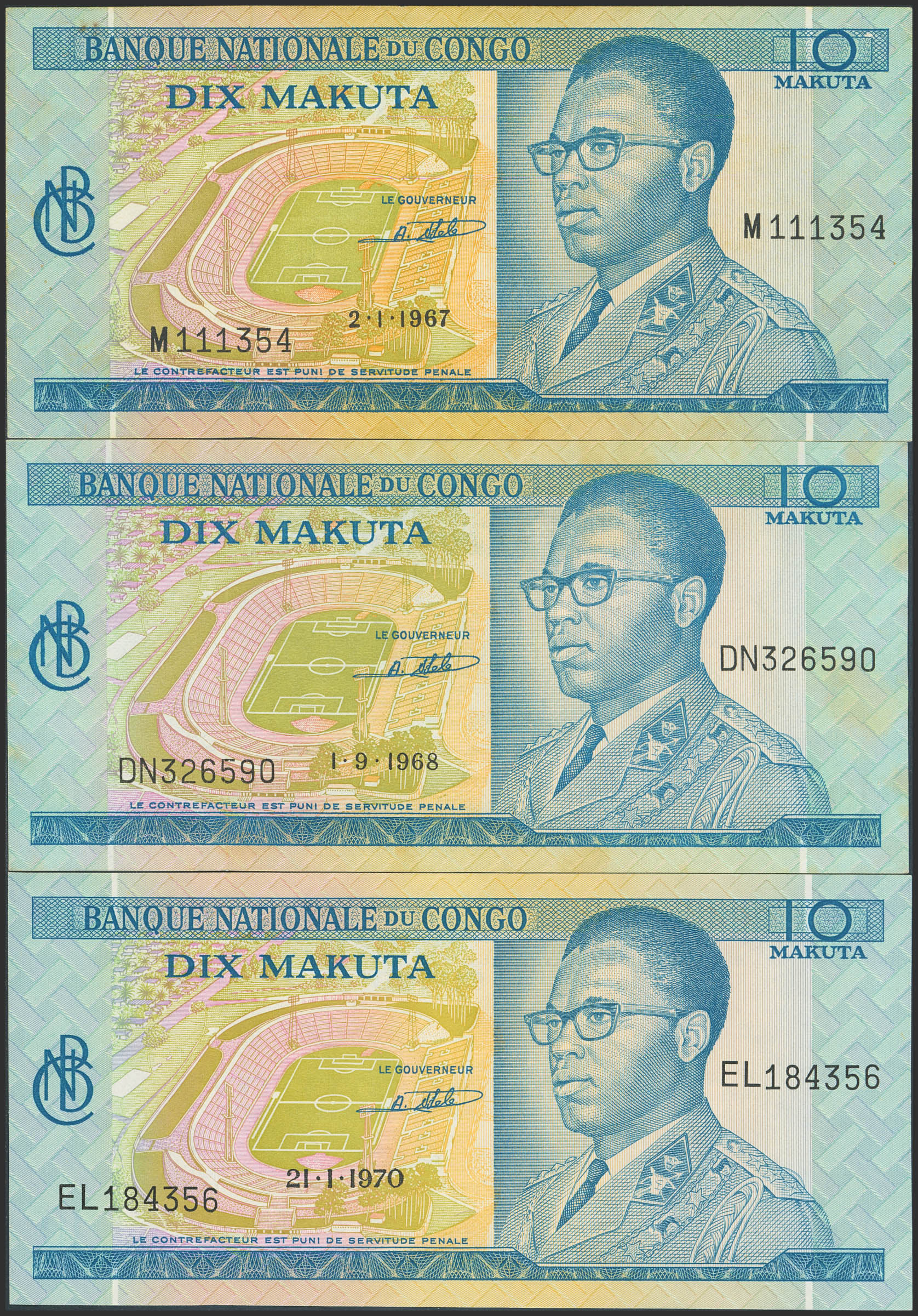 CONGO DEMOCRATIC REPUBLIC. Lot of 3 notes of 10 Makuta. 1967 to 1970. Banque Nationale. (Pick: 9a). Almost Uncirculated (2) and Uncirculated (1).