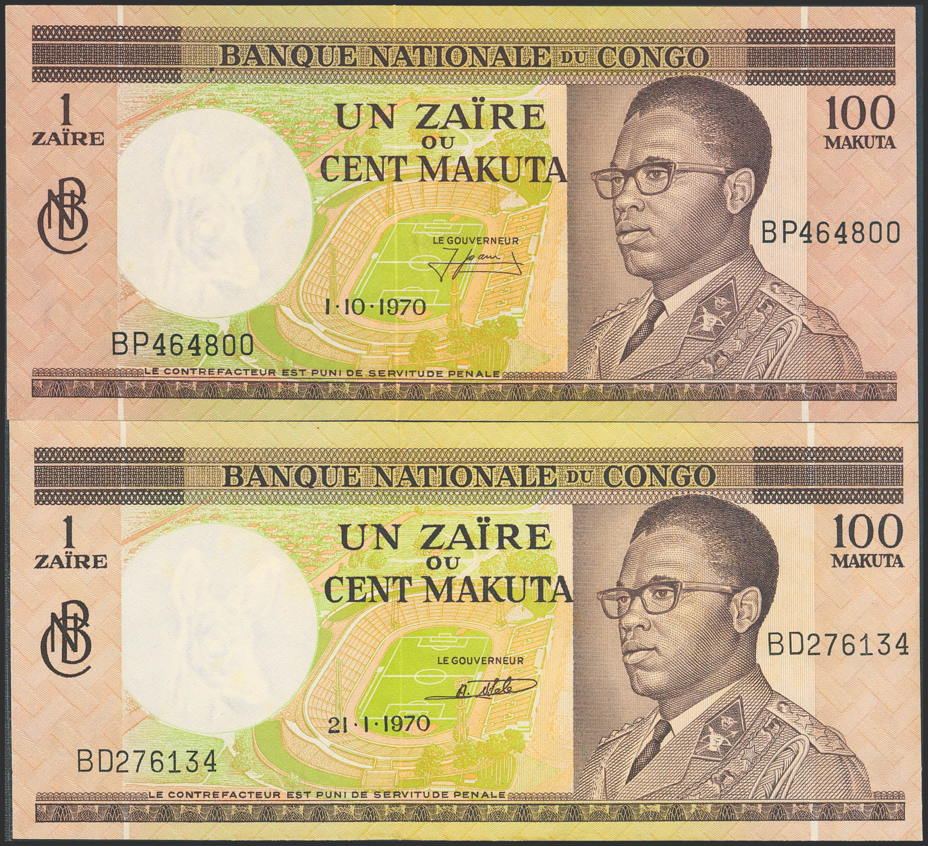 CONGO DEMOCRATIC REPUBLIC. Lot of 2 notes of 1 Zaire. 21 January 1970 and 1 October 1970. Banque Nationale. (Pick: 12a, 12b). Almost Uncirculated and Uncirculated.