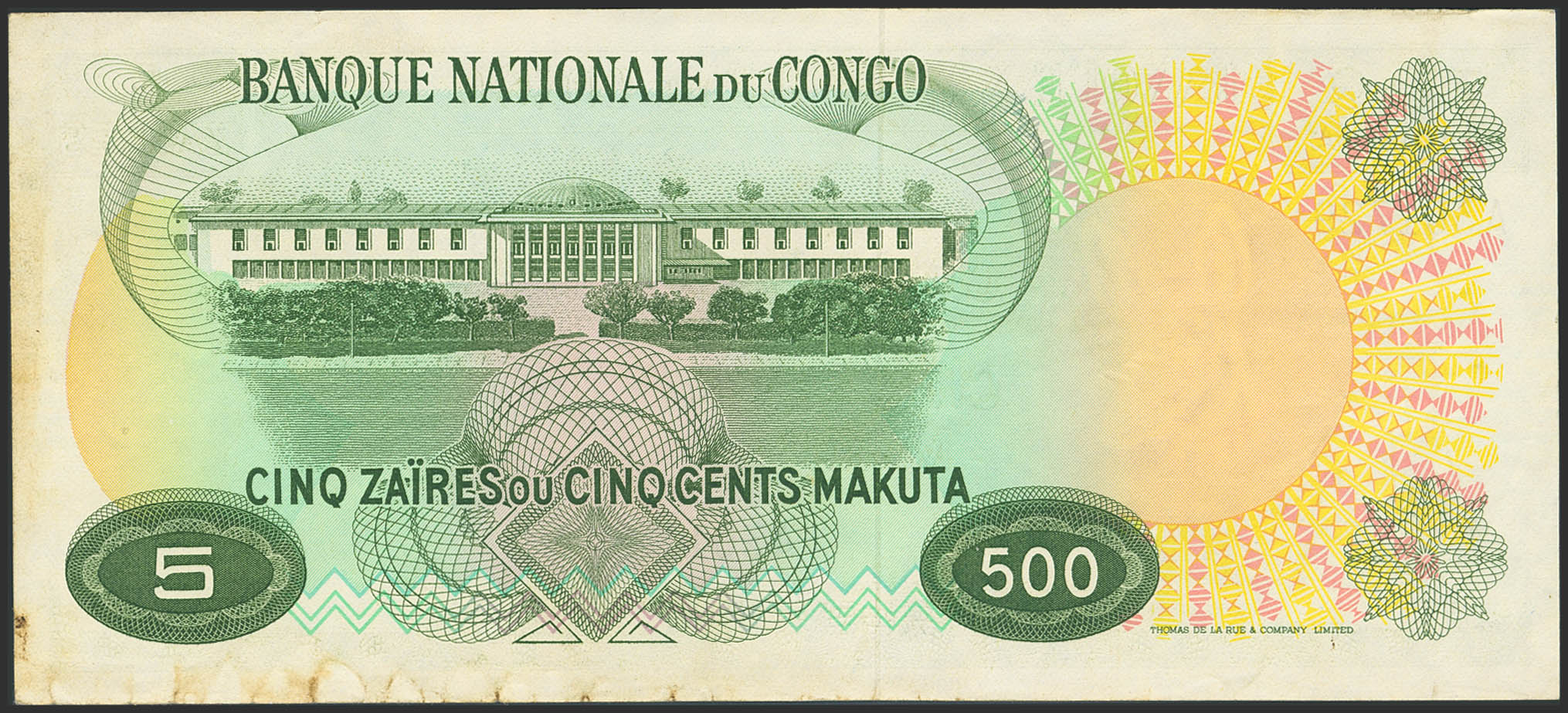 English CONGO DEMOCRATIC REPUBLIC. 5 Zaires. 2 January 1967. Banque Nationale. (Pick: 13a). Dirty lower edge. Extremely Fine.