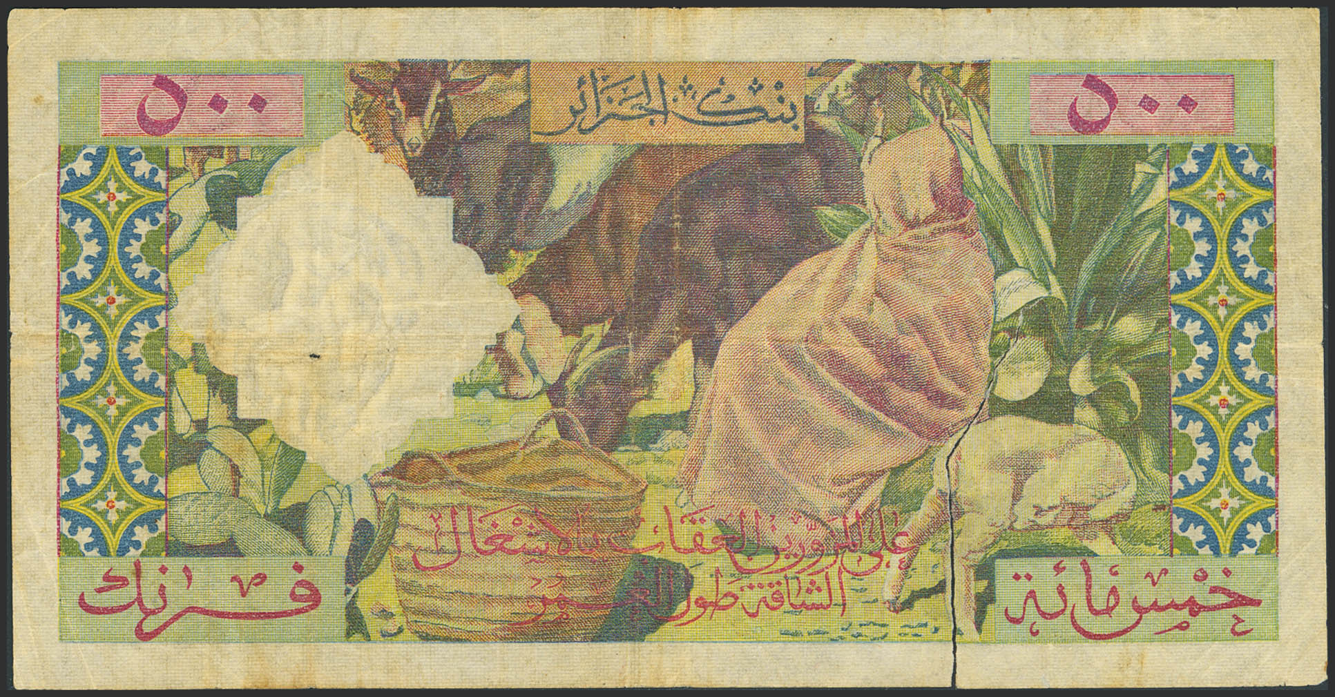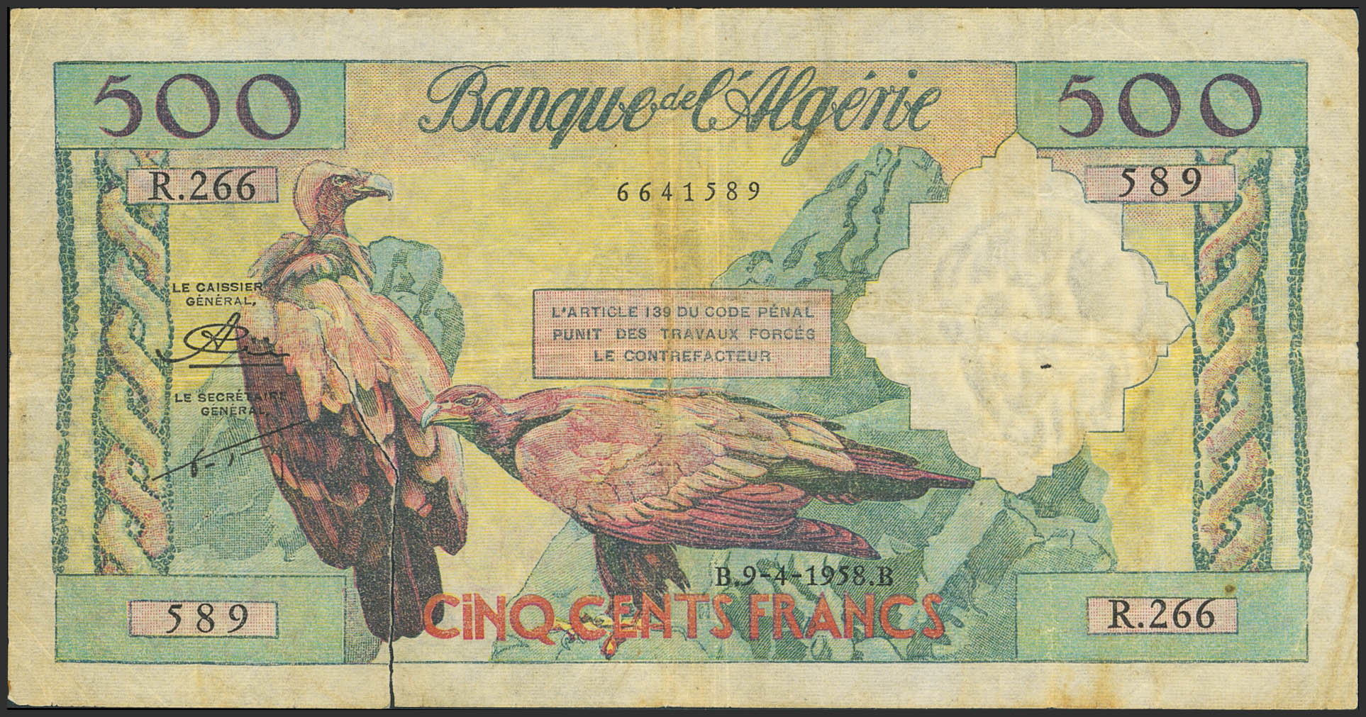 ALGERIA. 500 Francs. 9 April 1958. Banque de l'Algerie. (Pick: 117). Pinholes and tears. Fine.