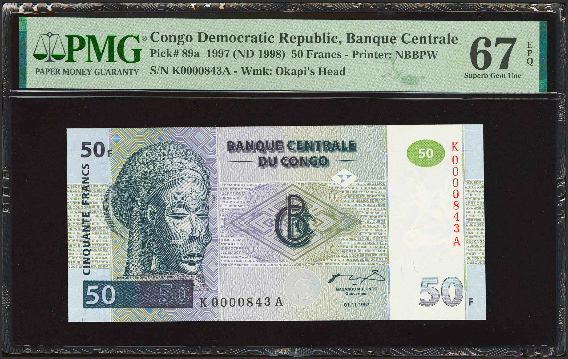 English CONGO DEMOCRATIC REPUBLIC. 50 Francs. 1 November 1997. Central Bank. (Pick: 89). PMG67EPQ.