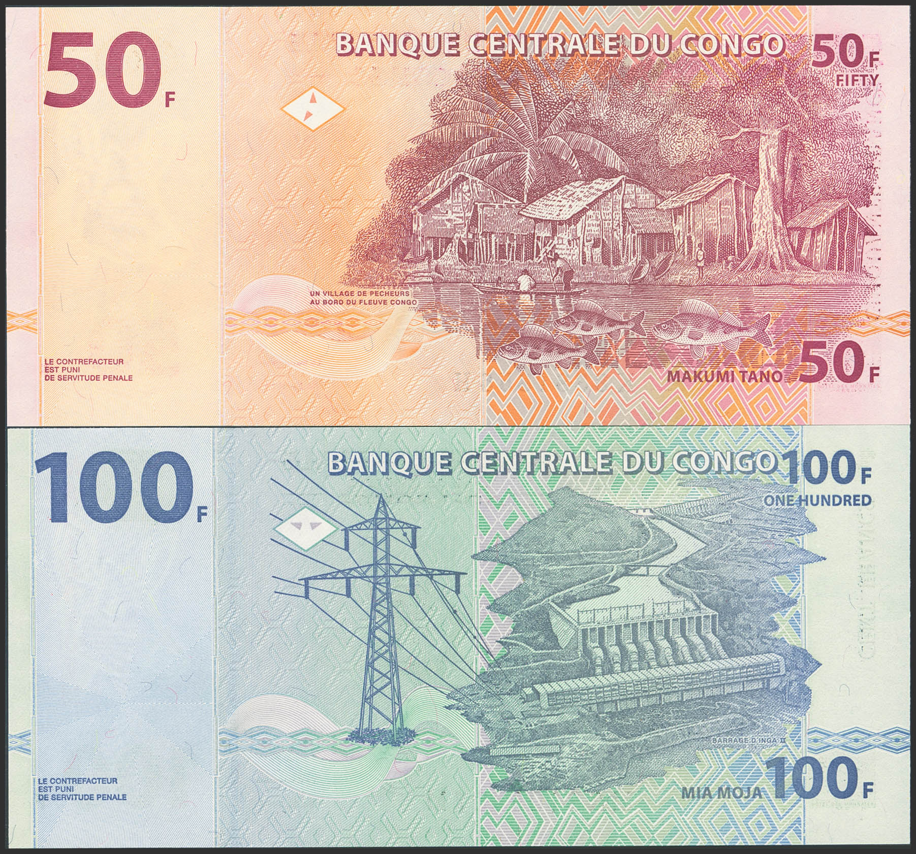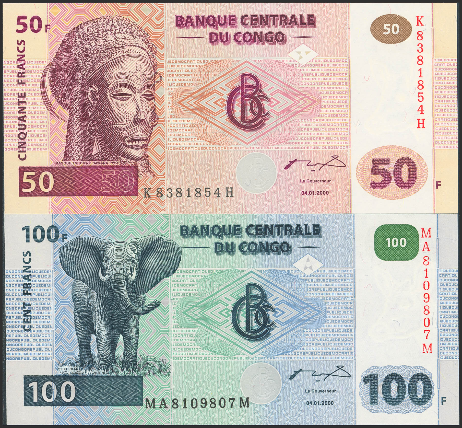 English CONGO DEMOCRATIC REPUBLIC. Lot of 2 notes of 50 and 100 Francs. 4 January 2000. Central Bank. (Pick: 91A, 92A). Uncirculated.