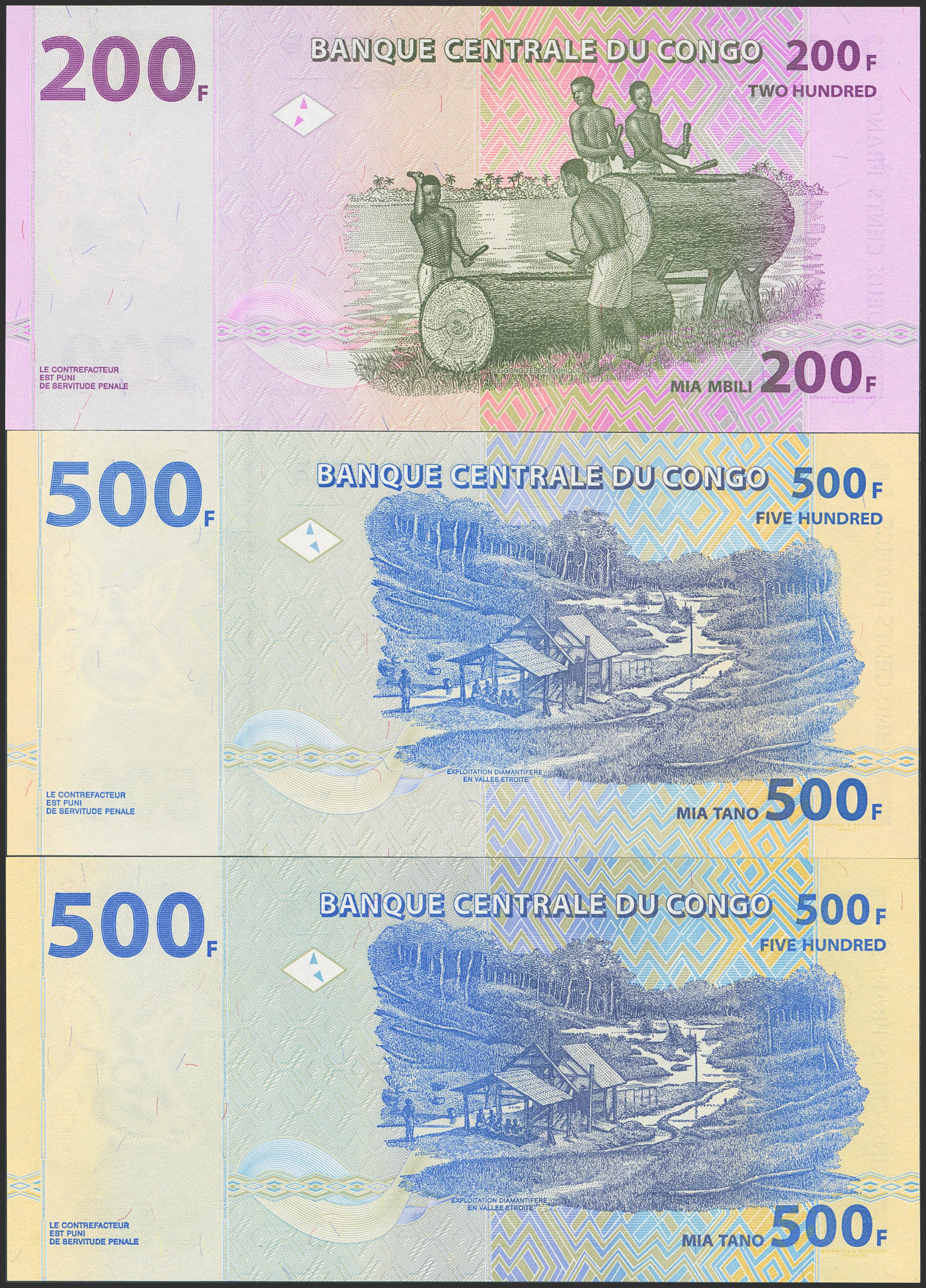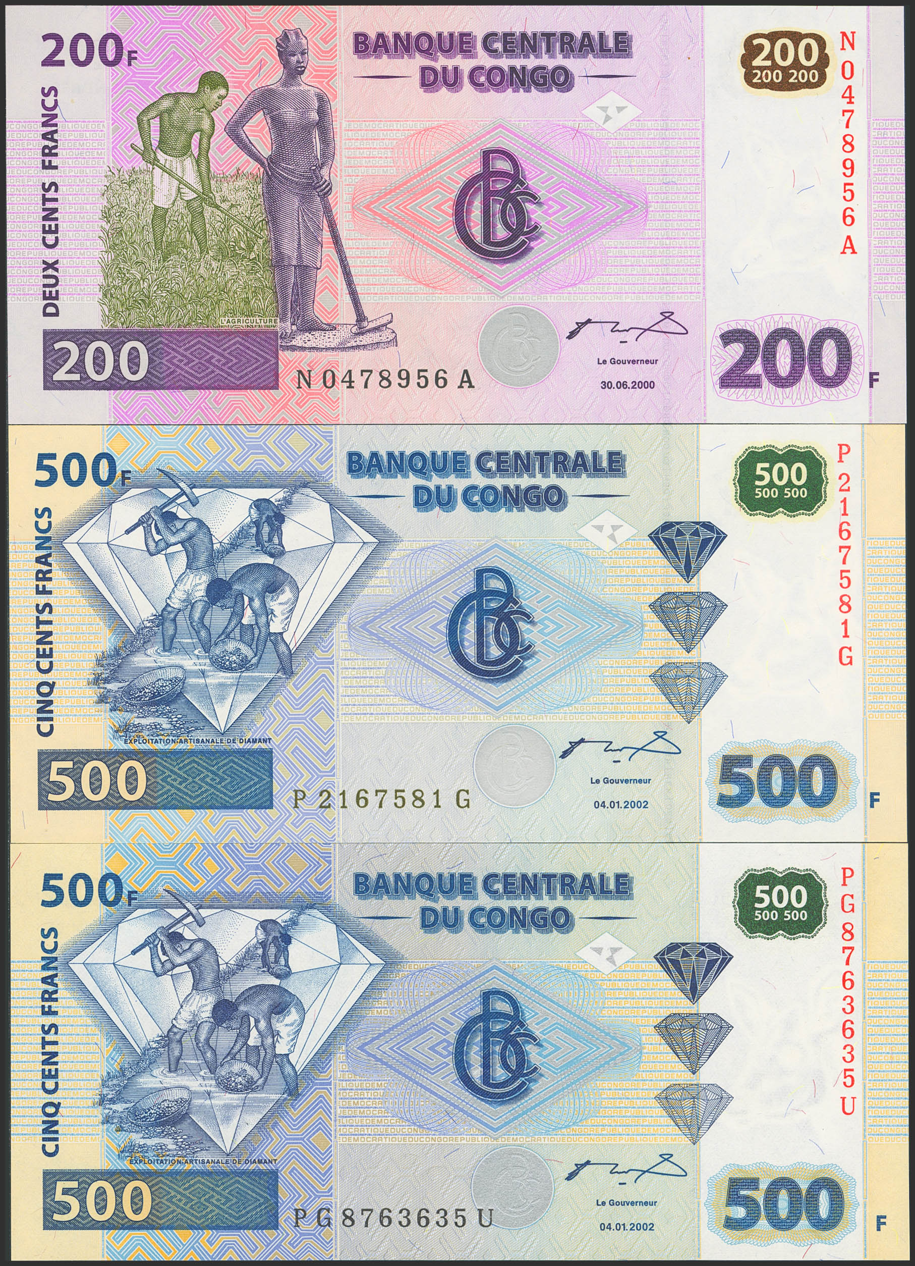 English CONGO DEMOCRATIC REPUBLIC. Lot of 3 notes of 200 and 500 Francs. 30 June 2000 and 4 January 2002. Banque Centrale. (Pick: 95a, 96a). Uncirculated.
