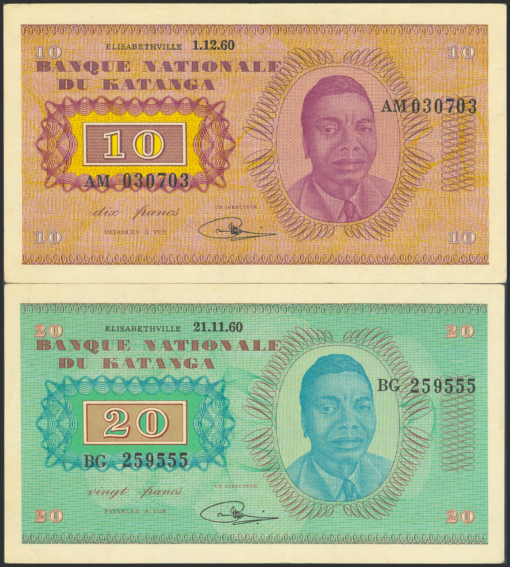 English CONGO-KATANGA. Lot of 2 notes of 10 and 20 Francs. 1960. Banque Nationale. (Pick: 5a, 6a). Almost Uncirculated.