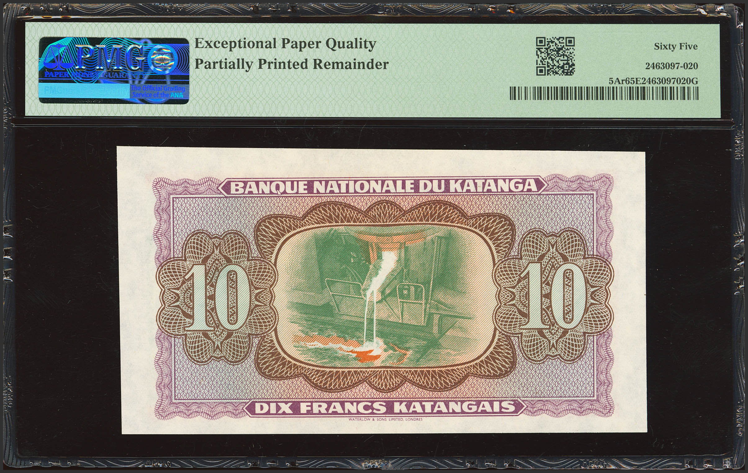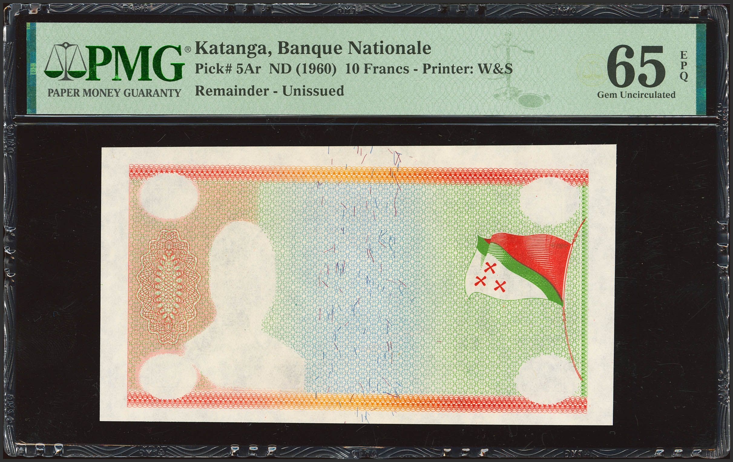 CONGO-KATANGA. 10 Katangais Francs. (1960ca). Bank Nationale. Printing error. Without series or signatures. (Pick: 5Ar). PMG65EPQ (partially printed remainder).