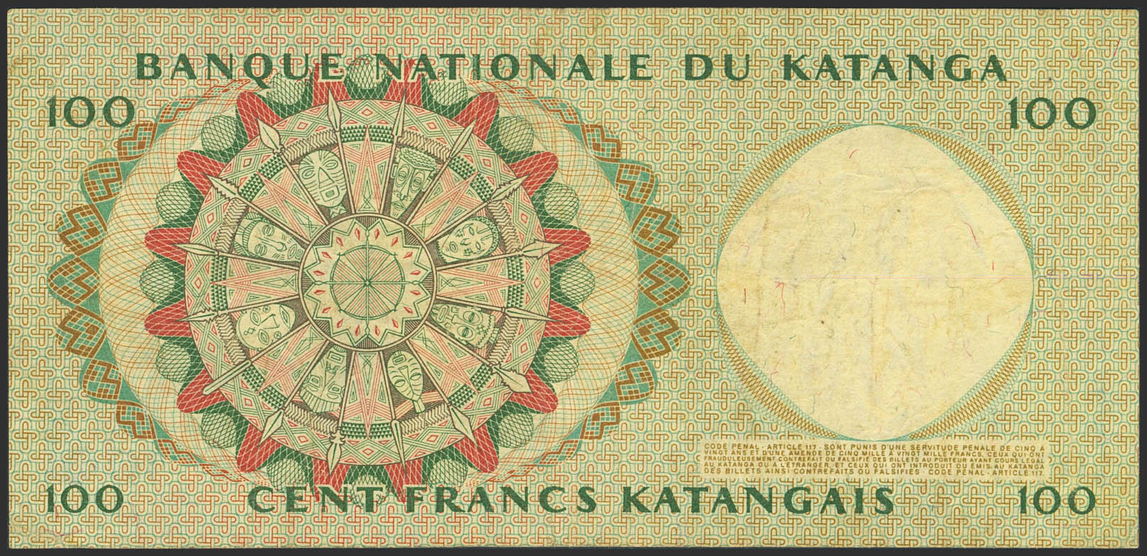 English CONGO-KATANGA. 100 Francs. May 18, 1962. Banque Nationale. (Pick: 12a). More than Fine.
