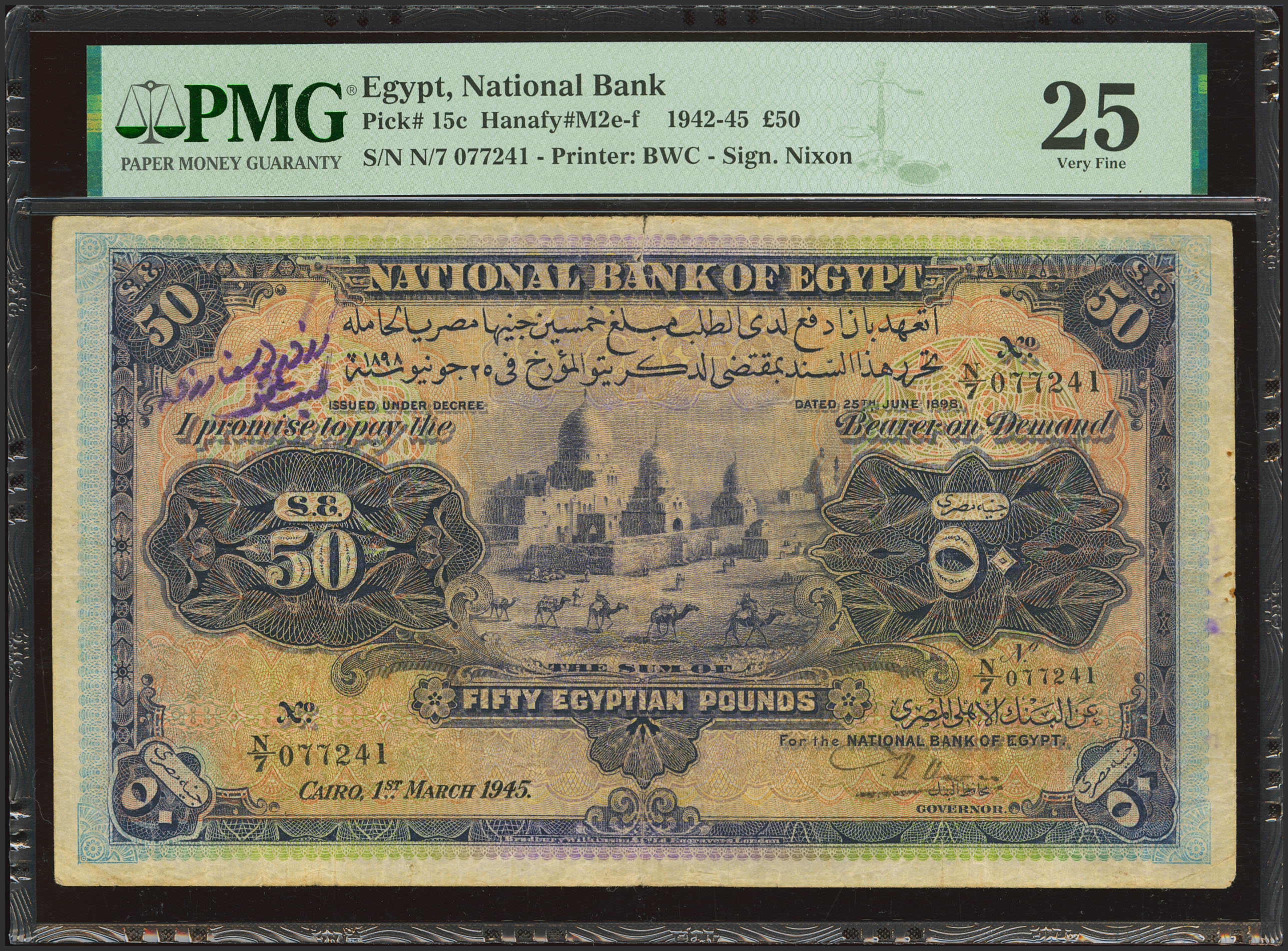 EGYPT. 50 Egyptian Pounds. March 1, 1945. National Bank. Signature of Nixon. (Pick: 15c). PMG25 (annotations, rust).