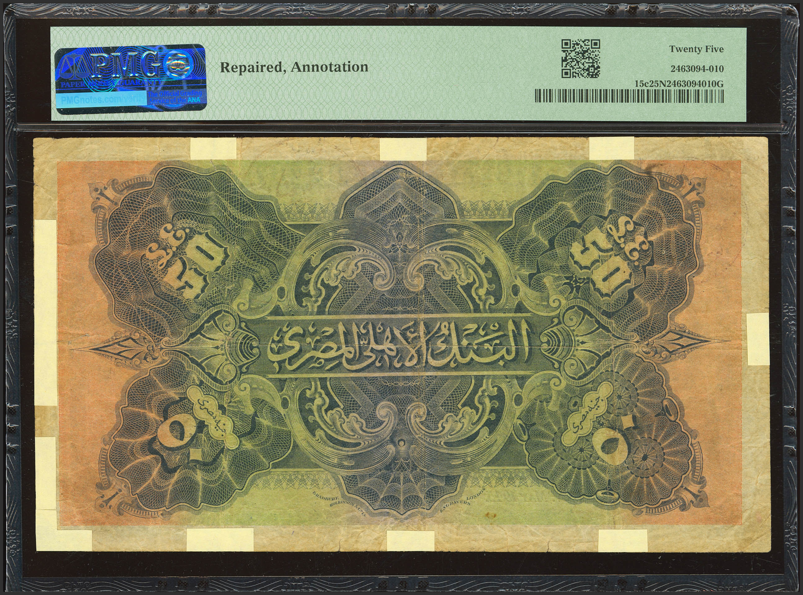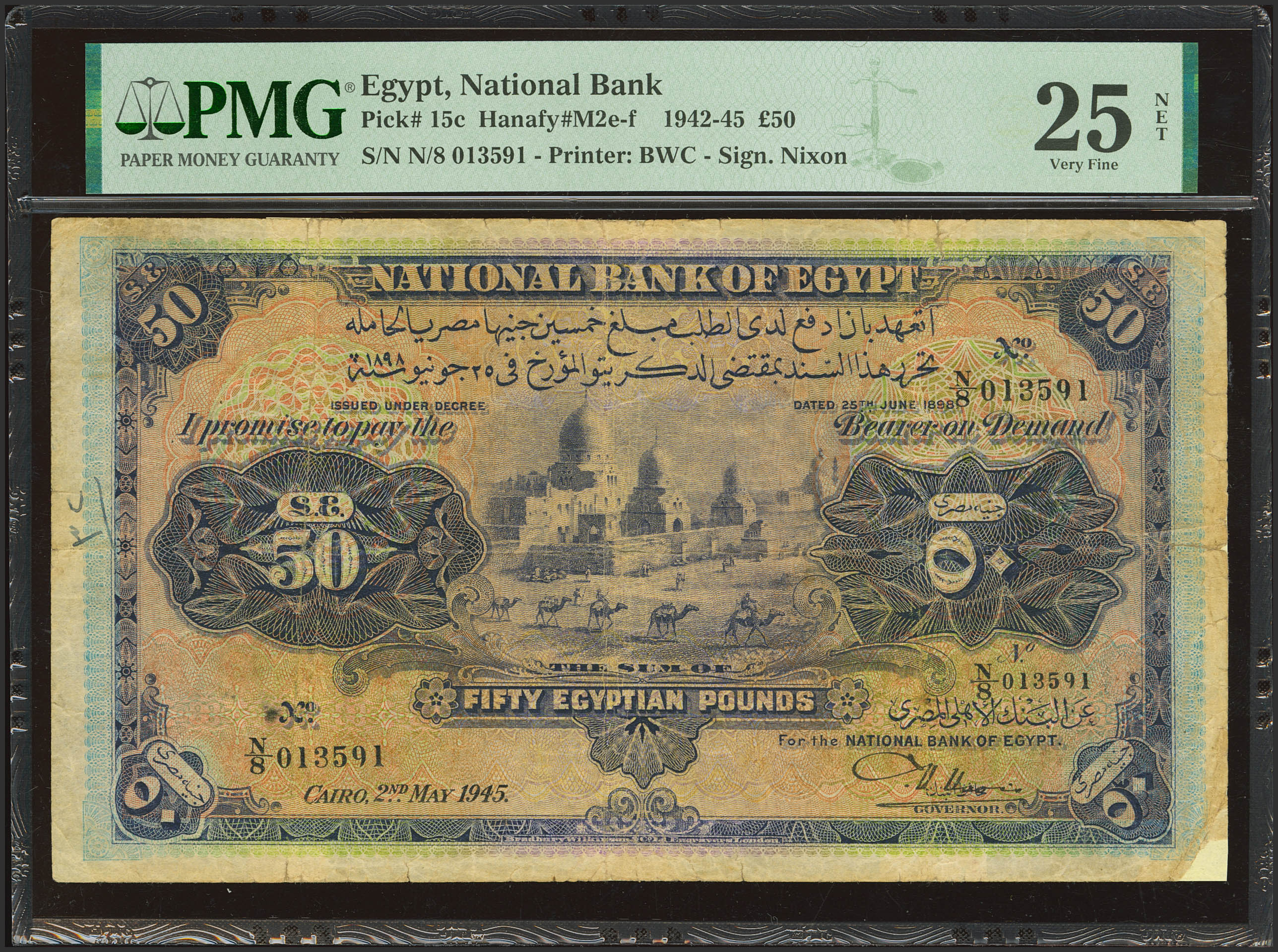 EGYPT. 50 Egyptian Pounds. May 2, 1945. National Bank. Signature of Nixon. (Pick: 15c). PMG25NET (repaired, annotation).
