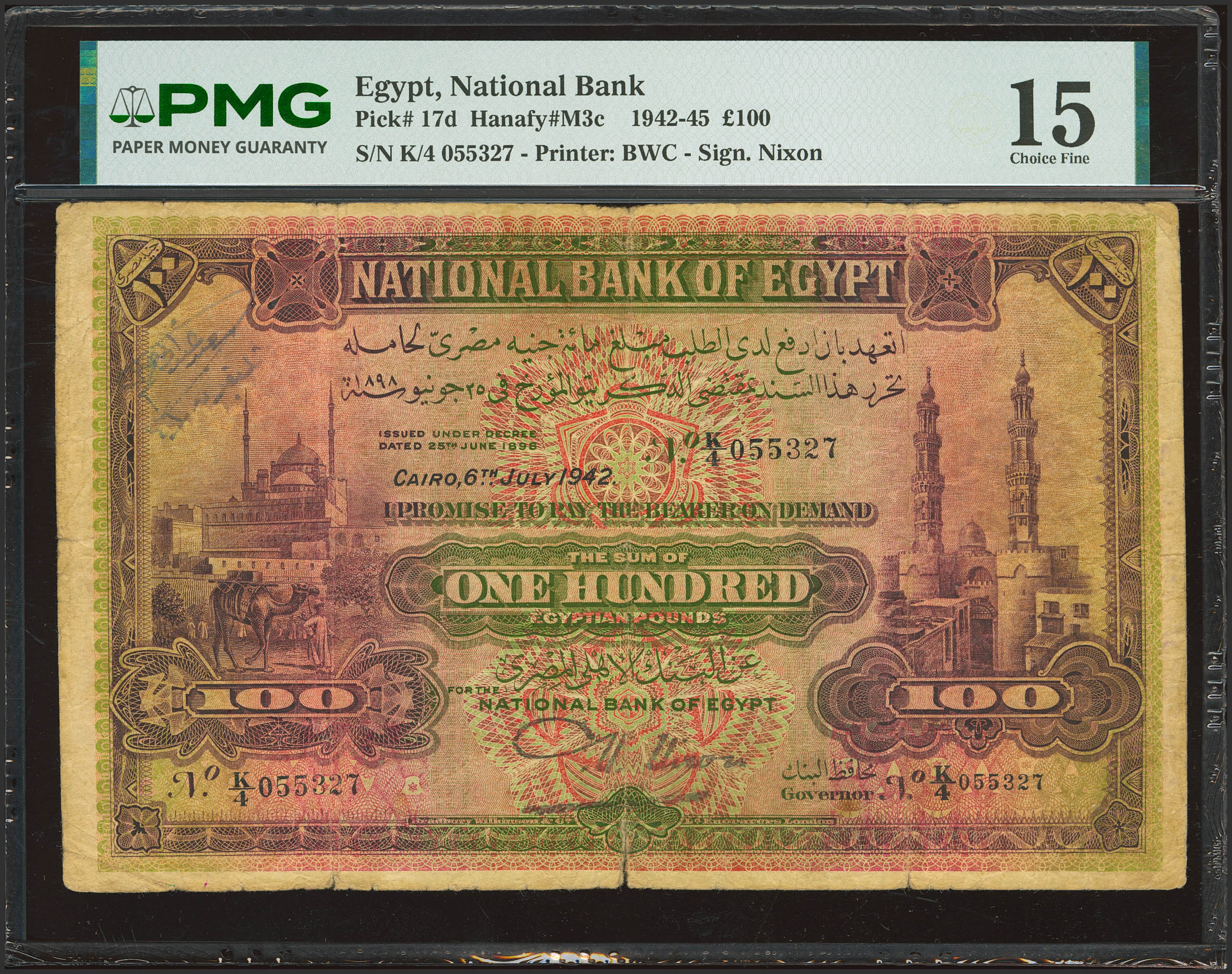 EGYPT. 100 Egyptian Pounds. 6 July 1942. National Bank. Signature of Nixon. (Pick: 17d). PMG15 (tear, annotations).