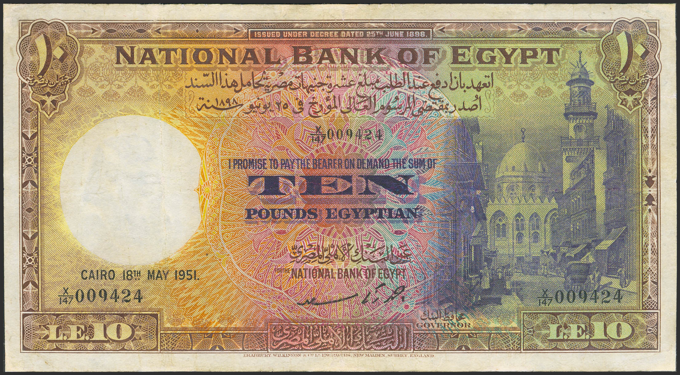 EGYPT. 10 Egyptian Pounds. May 18, 1951. National Bank. (Pick: 23d). Restored. Very Fine.