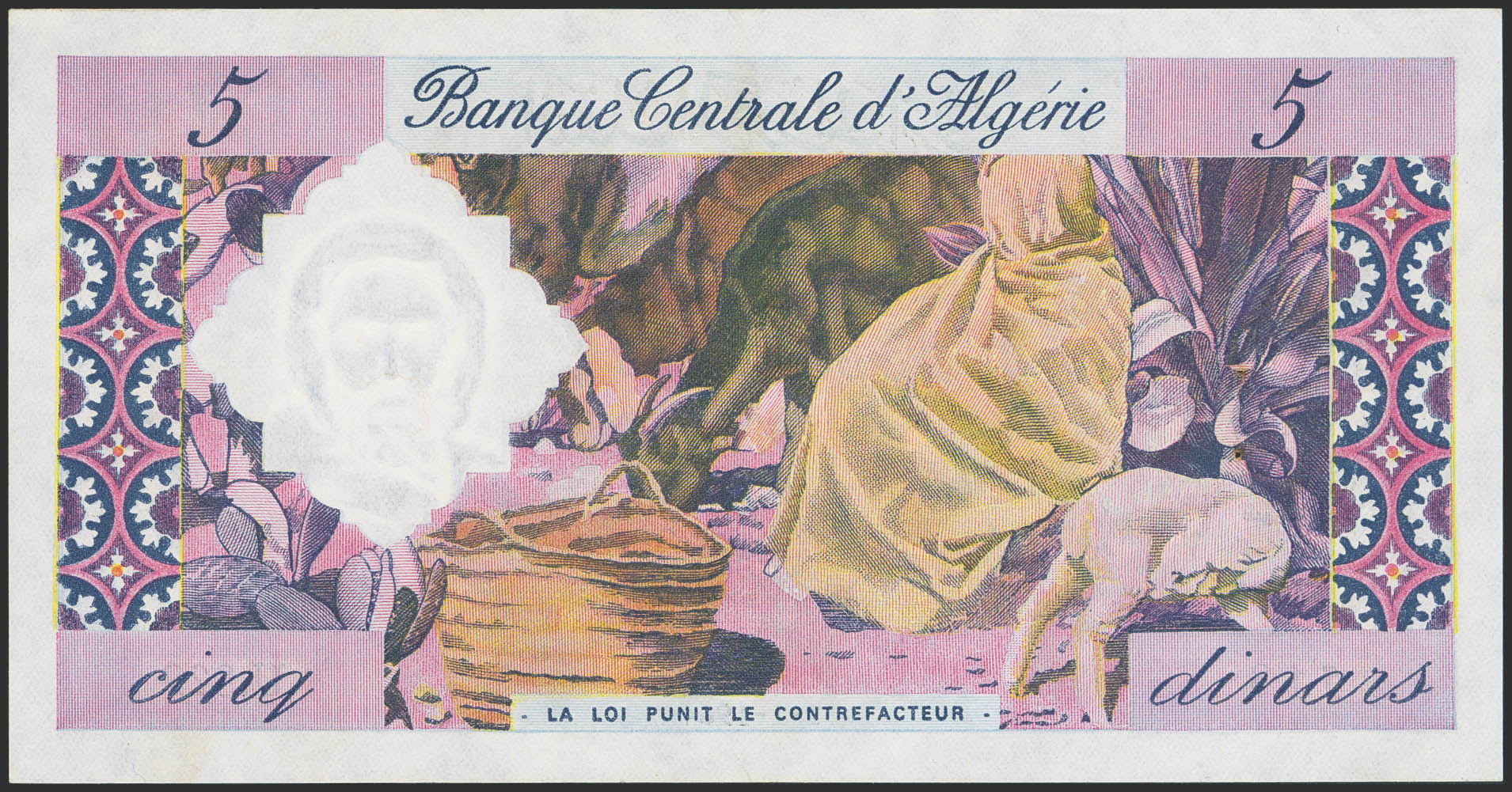ALGERIA. 5 Dinars. 1 January 1964. Banque Centrale d'Algerie. Algerian Block style. (Pick: 122b). Staple holes. More than Extremely Fine.
