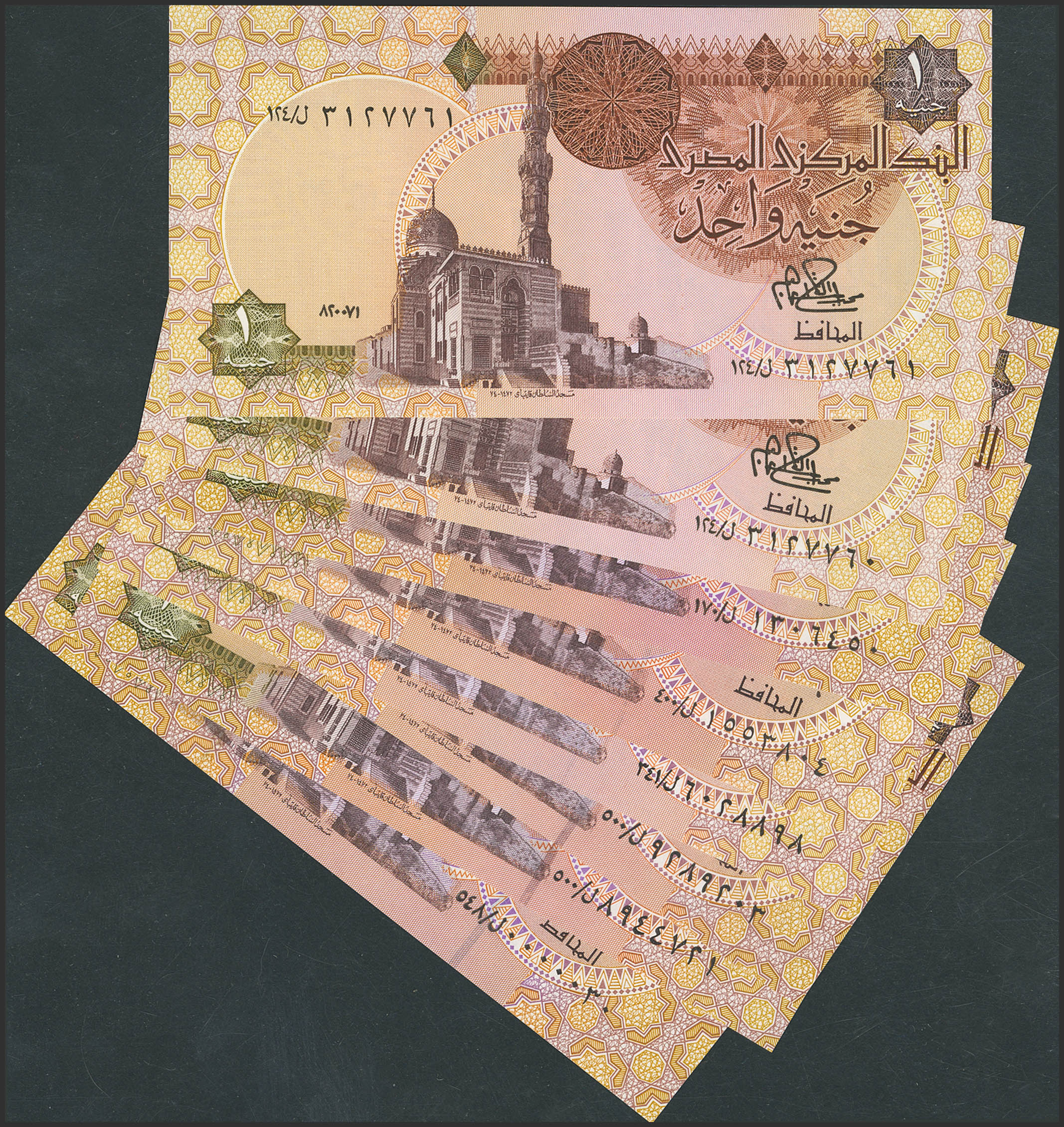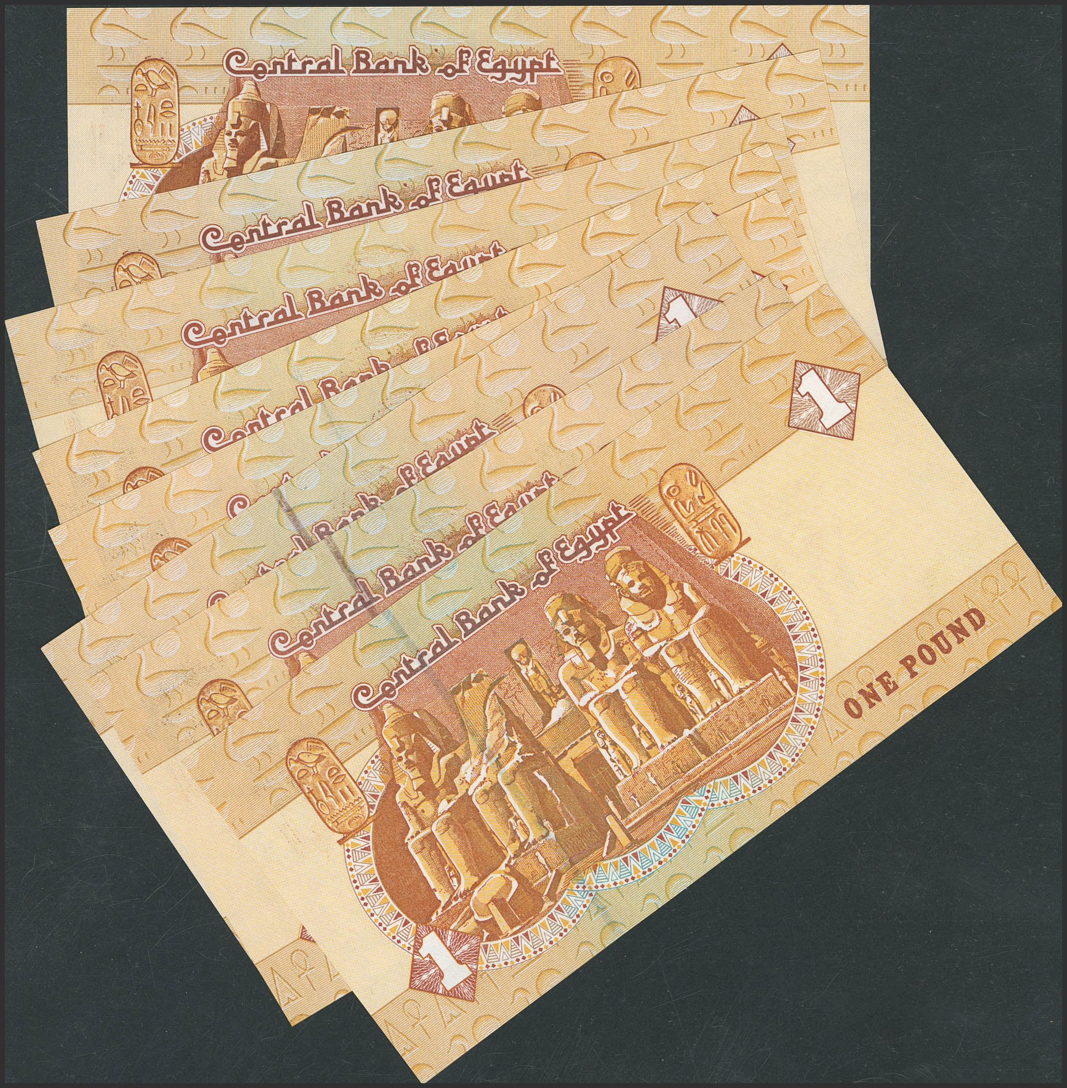EGYPT. Lot of 8 notes of 1 Pound. 1981 to 2007. Central Bank. The lot includes a '500' replacement-series note and a low serial number. (Pick: 50a(2), 50d(1), 50e(2), 50f(1), 50gr(1), 50m(1)). Uncirculated.