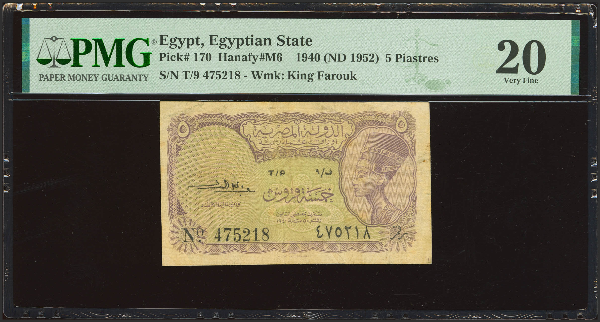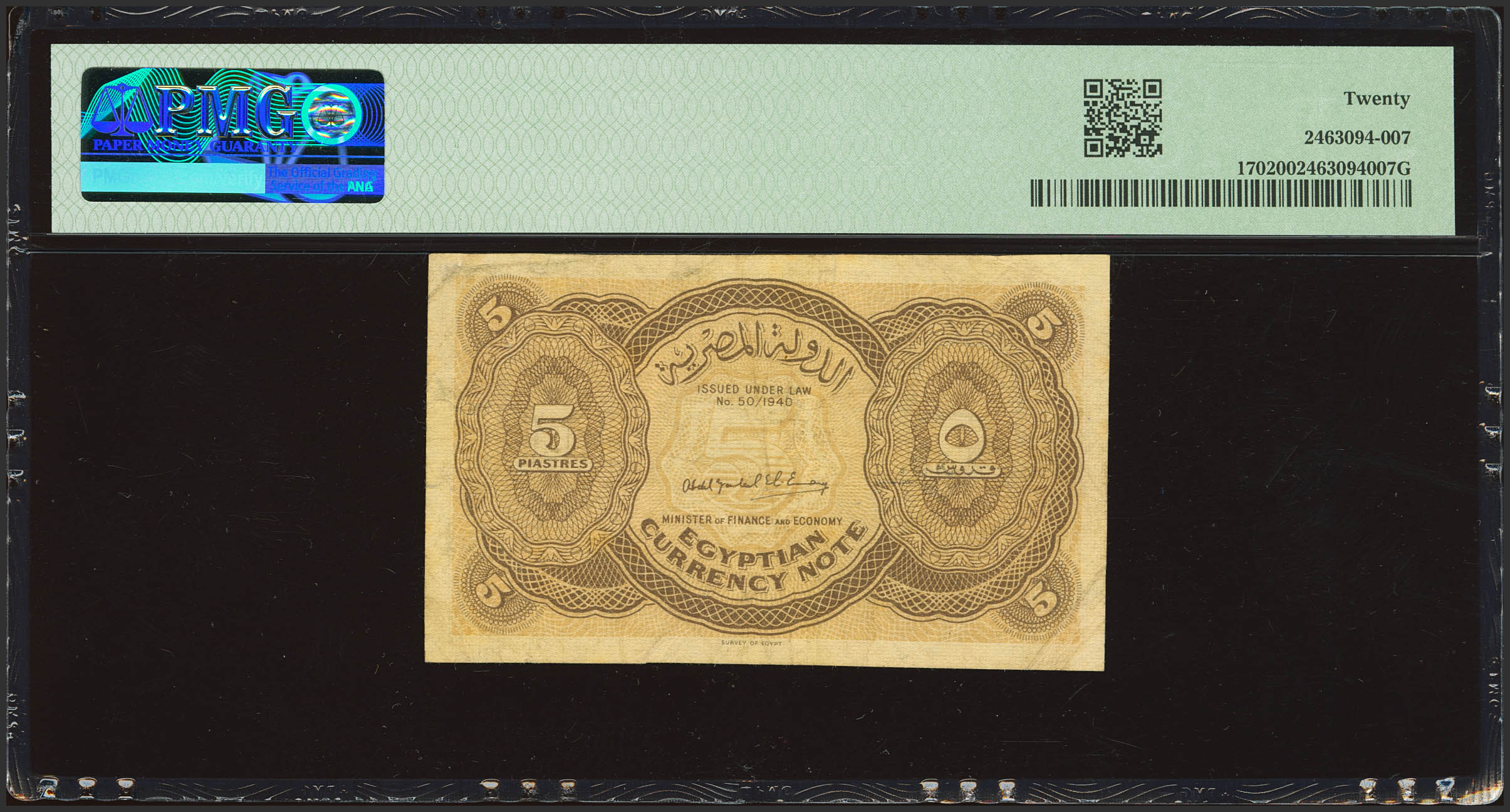 EGYPT. 5 Piastres. 1940. Egyptian State Currency Note. (Pick: 170). PMG20.