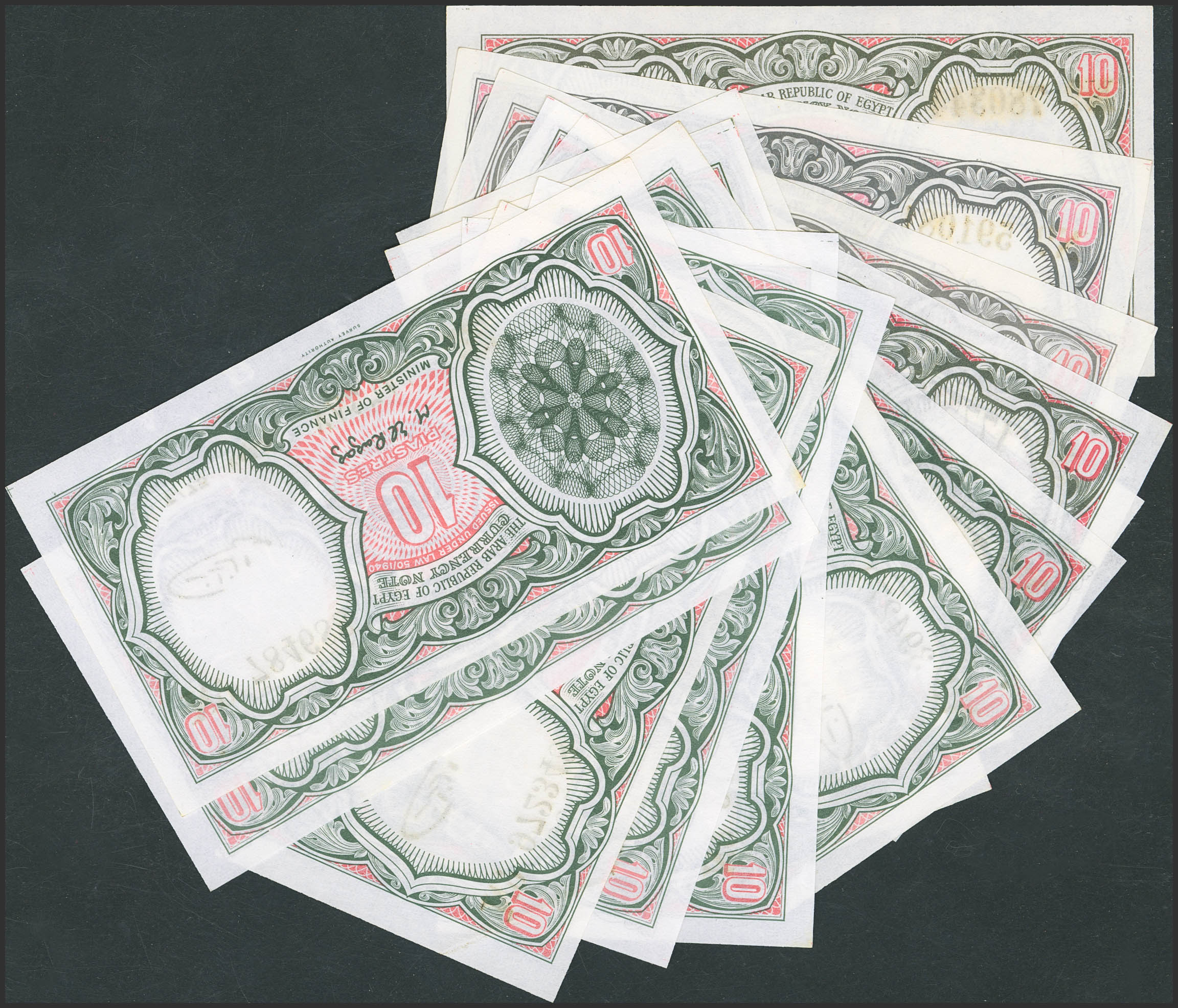 EGYPT. Lot of 14 notes of 10 Piastres. 1940. Arab Republic. Mixed subreferences. (Pick: 183, 184b). Almost Uncirculated (1) and Uncirculated (13).
