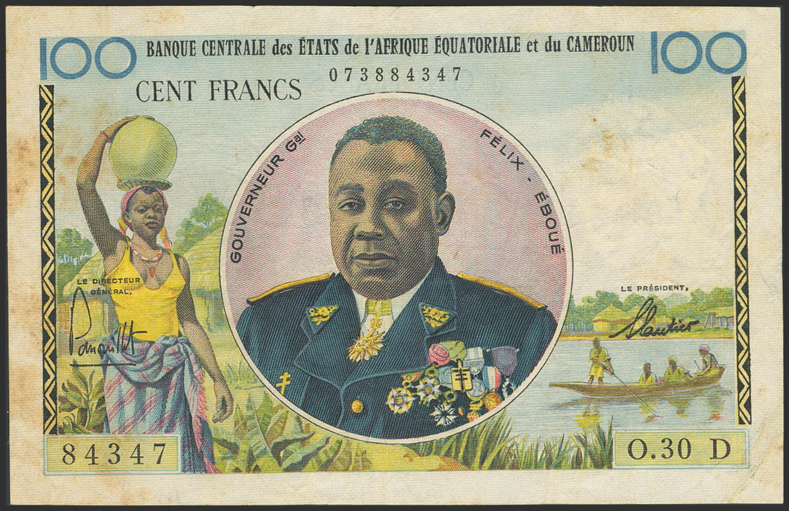 English EQUATORIAL AFRICAN STATES. 100 Francs. (1961ca). Central Bank. Gabon. (Pick: 1d). Stains. Very Fine.