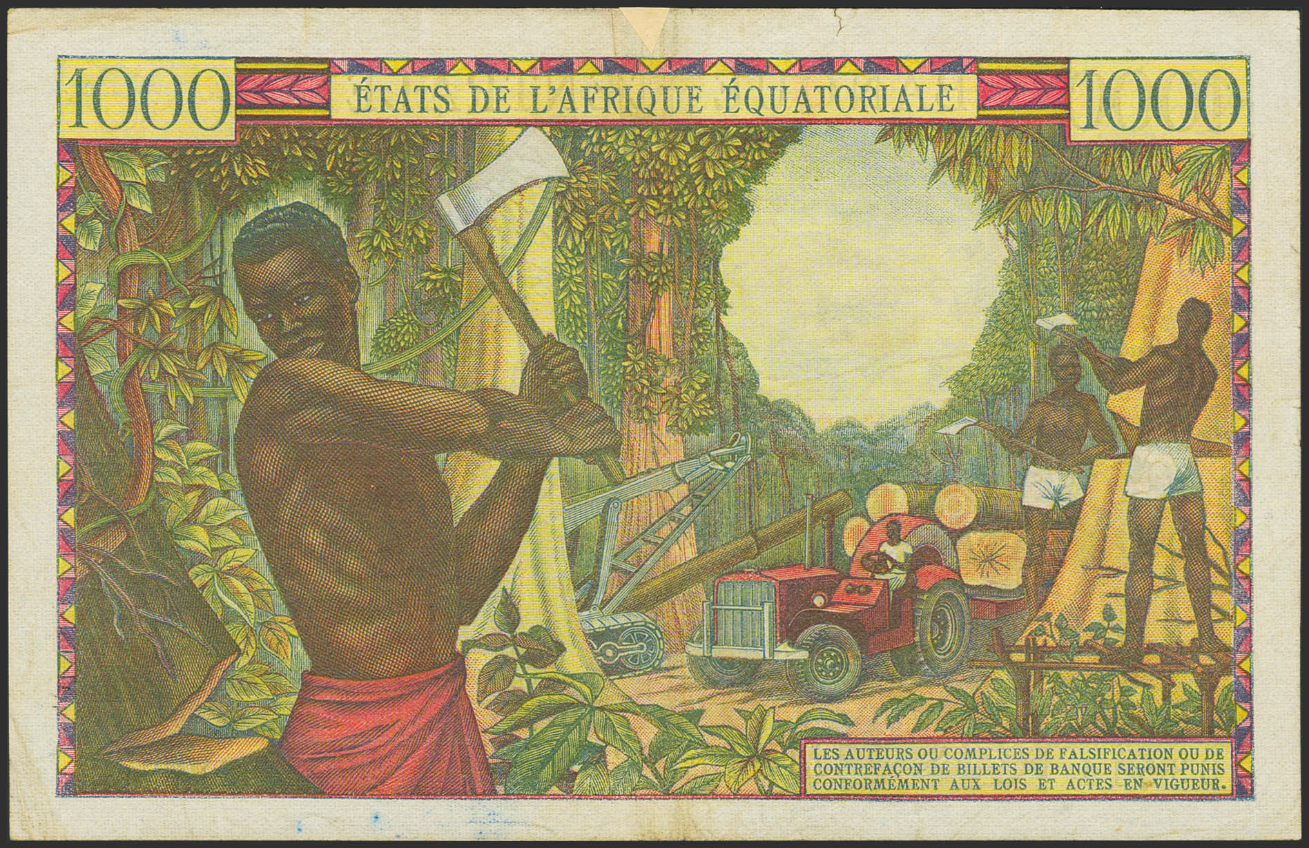 English EQUATORIAL AFRICAN STATES. 1000 Francs. (1963ca). Central Bank. Chad. (Pick: 5a). Adhesive paper added over tears on upper edge. More than Fine.