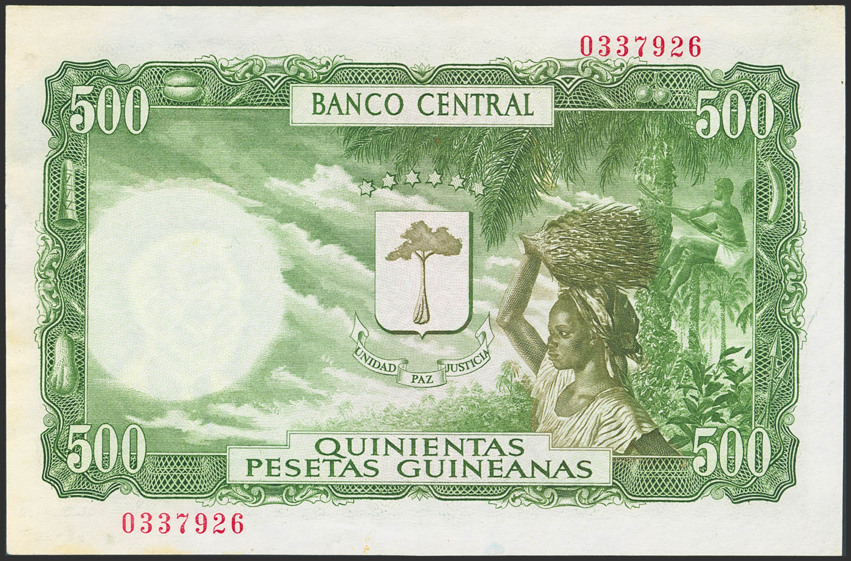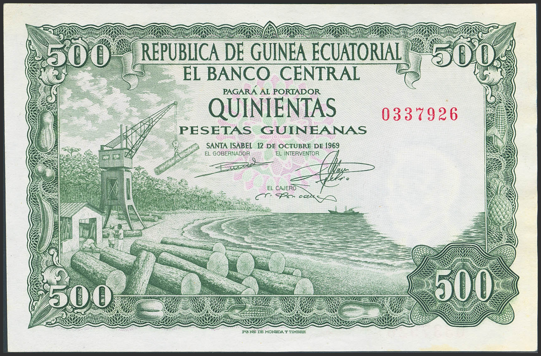 EQUATORIAL GUINEA. 500 Pesetas. October 12, 1969. Central Bank. (Pick: 2). Almost Uncirculated.