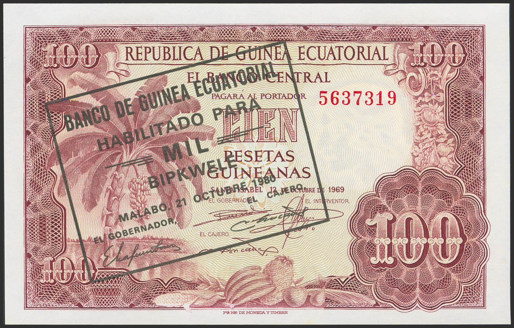 EQUATORIAL GUINEA. 1000 Bipkwele. 21 October 1980. Bank of Equatorial Guinea. (Pick: 18). Handling marks. Less than Uncirculated.