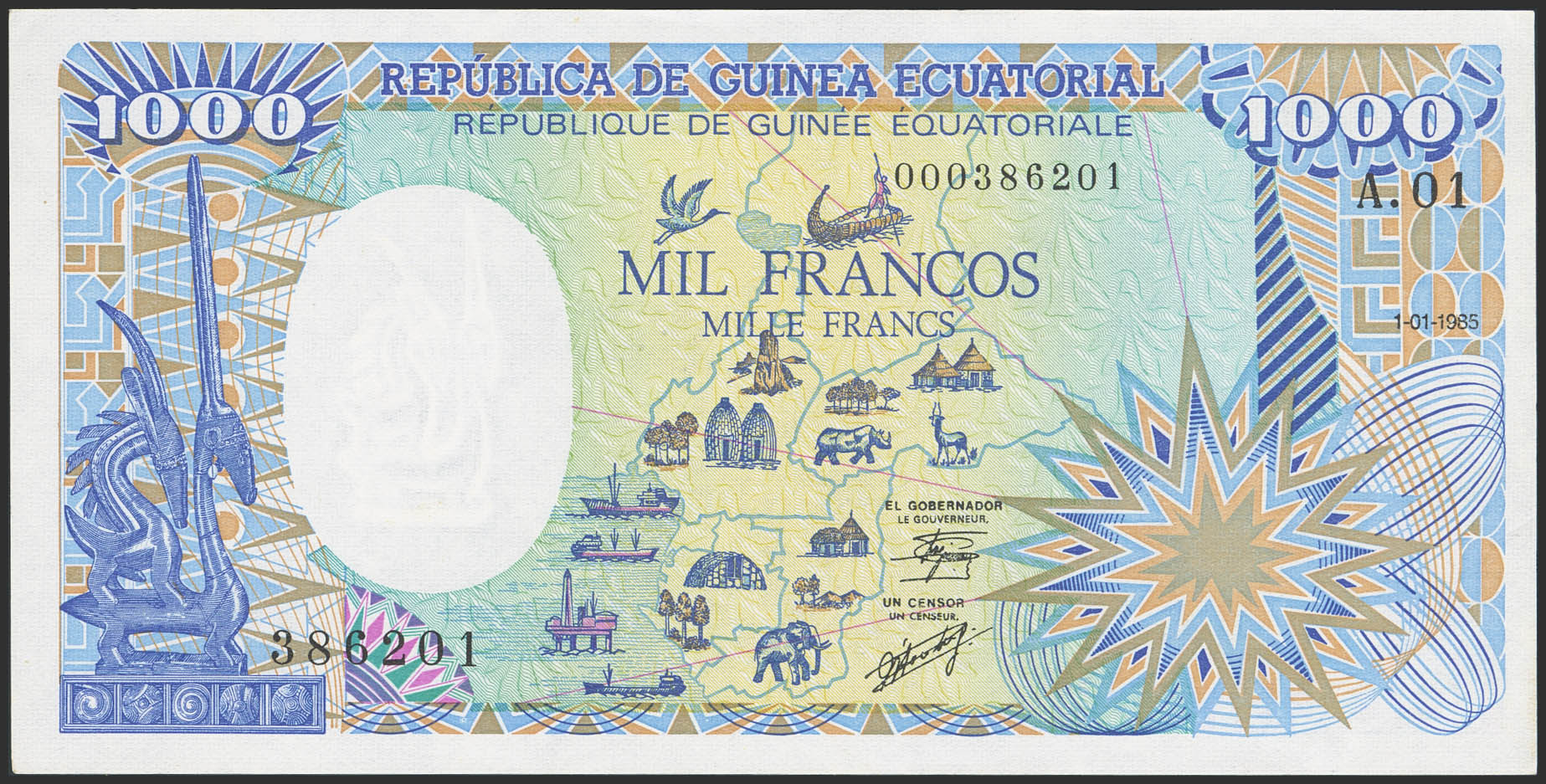 EQUATORIAL GUINEA. 1000 Francs. 1 January 1985. Banque des Etats de l'Afrique Centrale. Republic of Equatorial Guinea. (Pick: 21). Uncirculated.