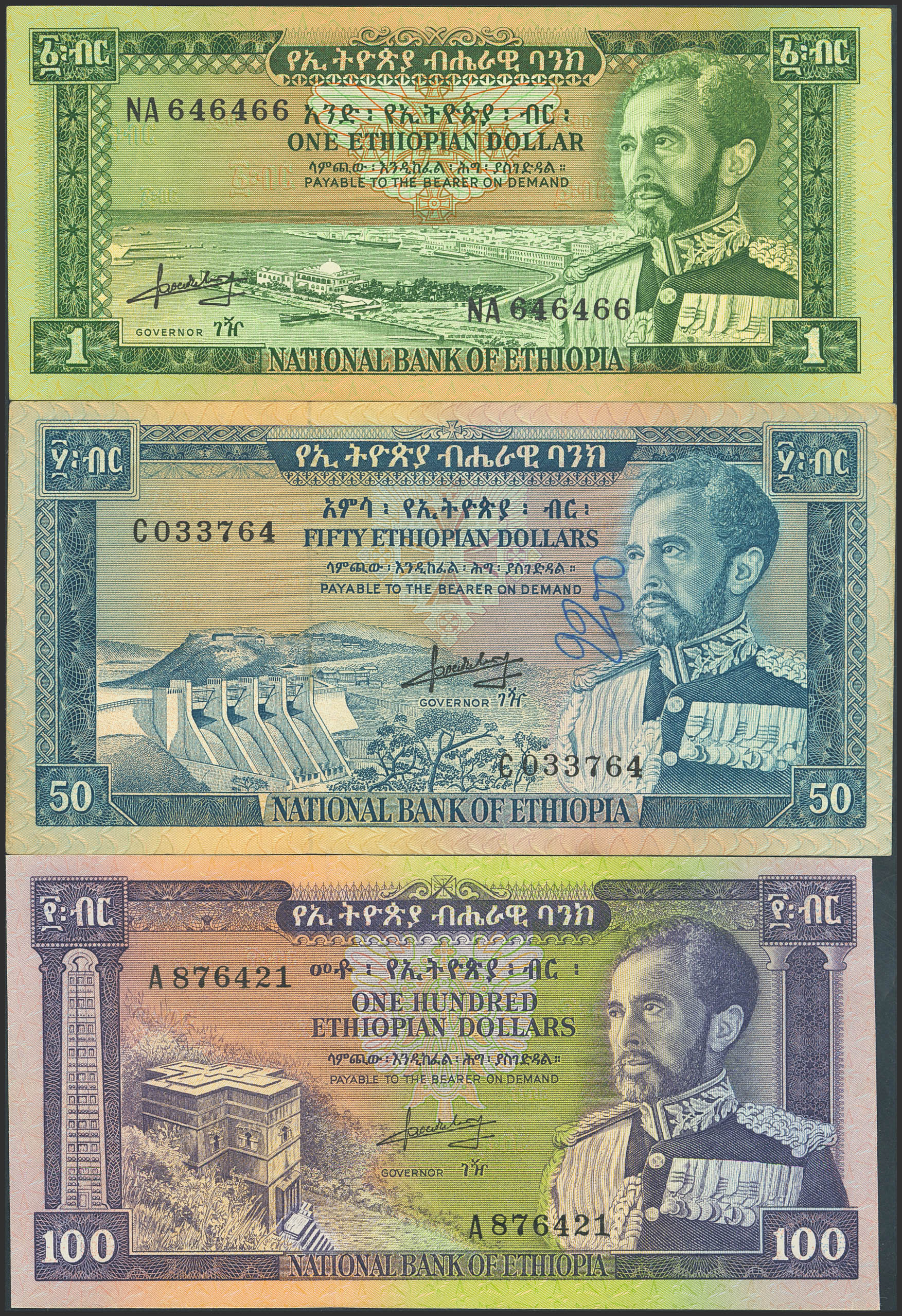 ETHIOPIA. Lot of 3 notes of 1, 50 and 100 Ethiopian Dollars. (1966ca). National Bank. (Pick: 25, 28, 29). Uncirculated, Extremely Fine Restored (P28) and Extremely Fine.