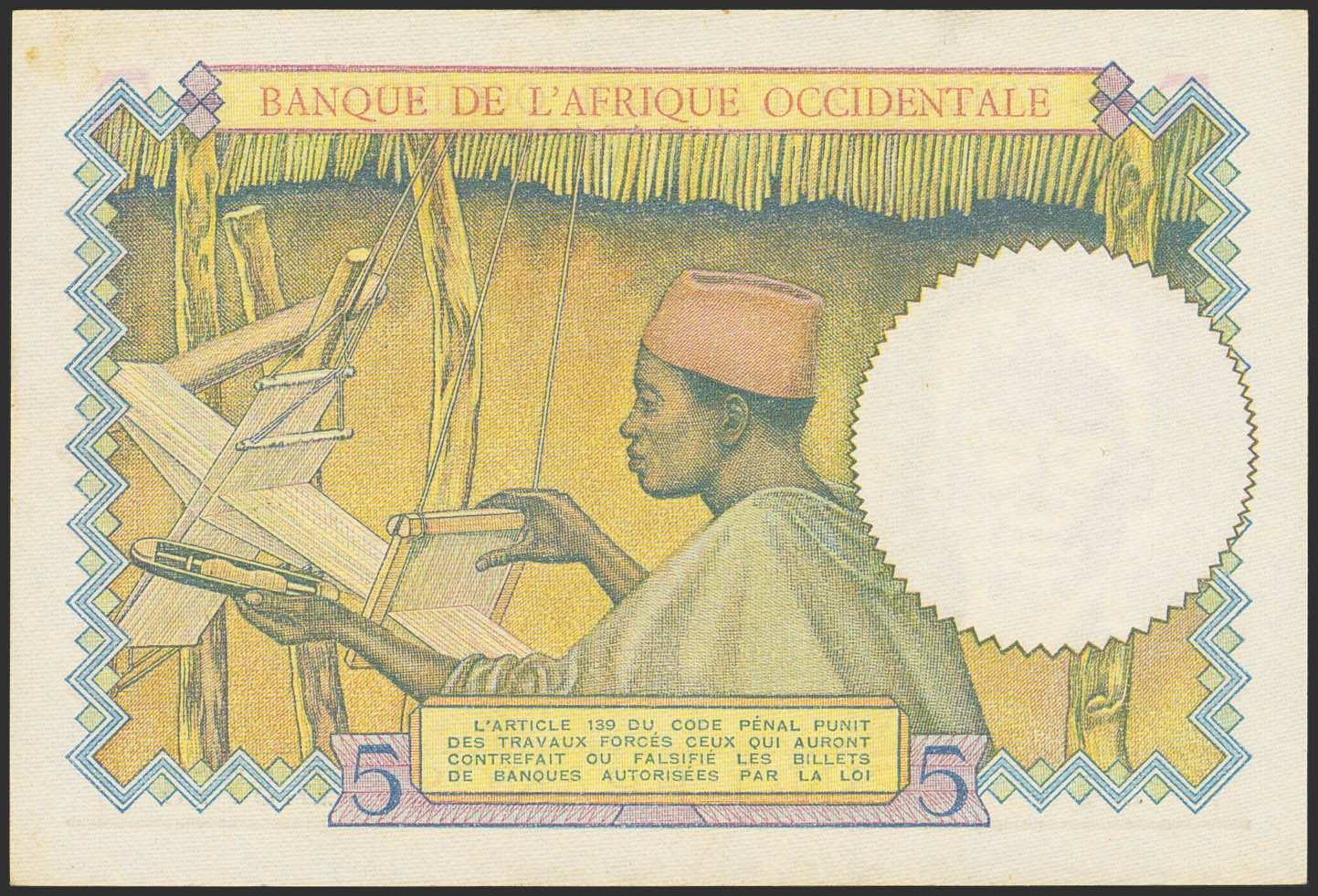 FRENCH WEST AFRICA. 5 French. 12 August 1937. Banque de l'Afrique Occidentale. (Pick: 21). Uncirculated.