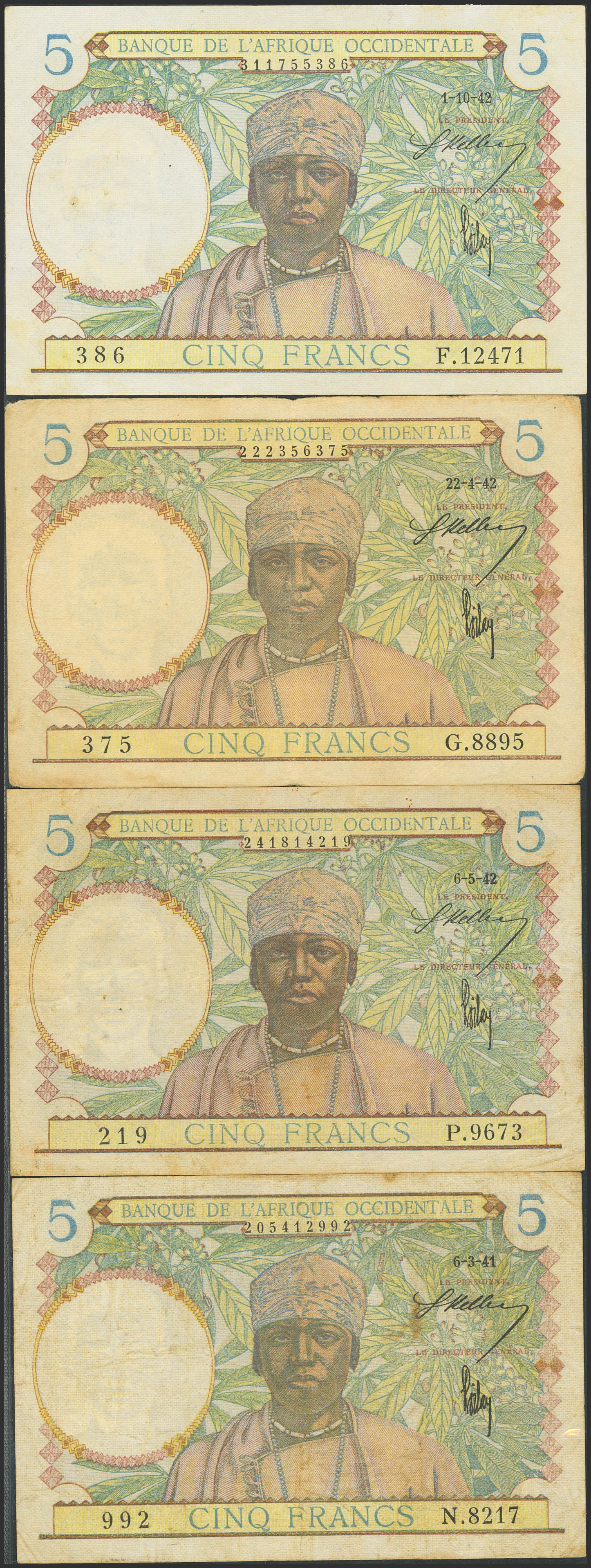FRENCH WEST AFRICA. Lot of 4 notes of 5 Francs. 6 March 1941. Banque de l'Afrique Occidentale. (Pick: 25). Very Fine to Almost Uncirculated.