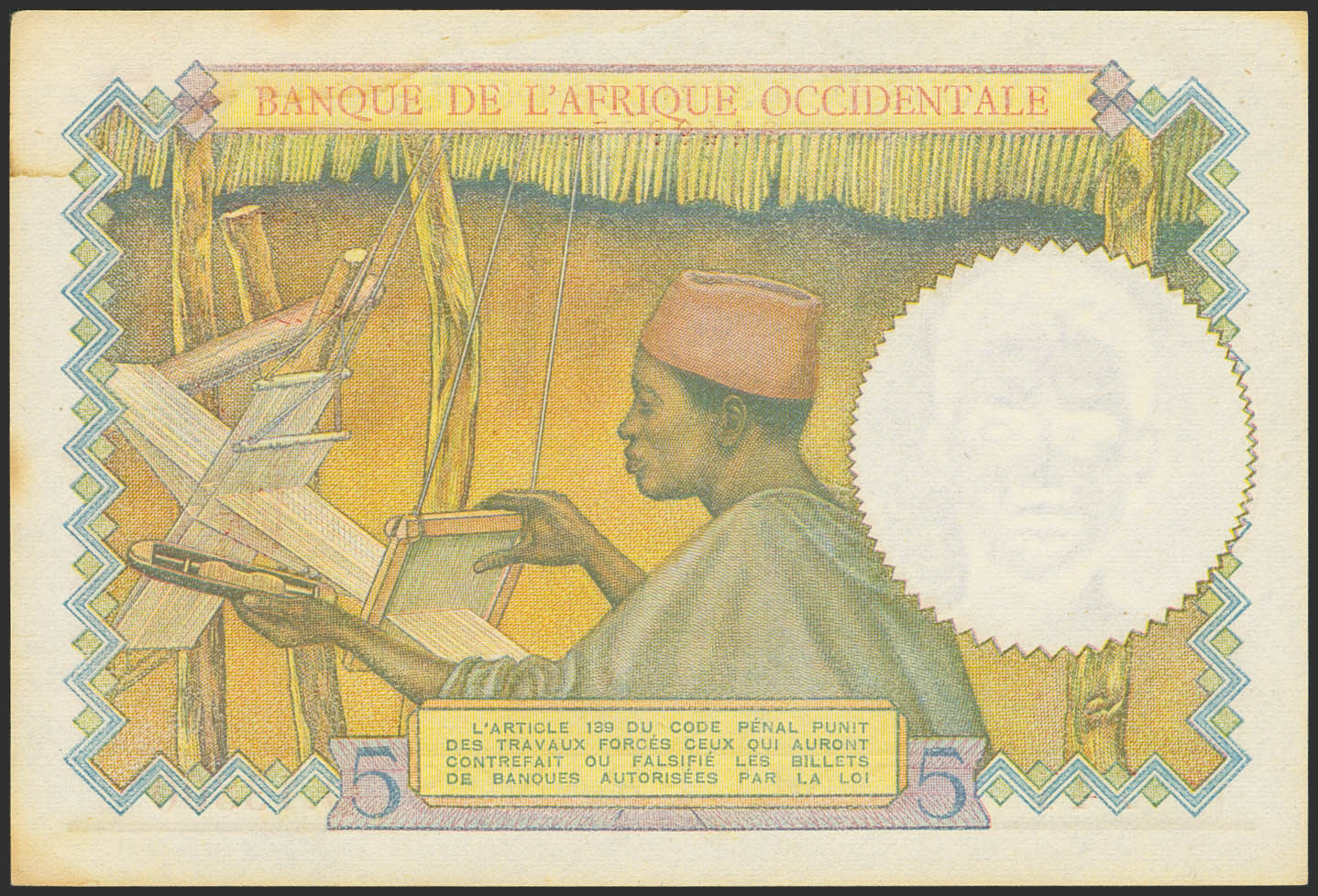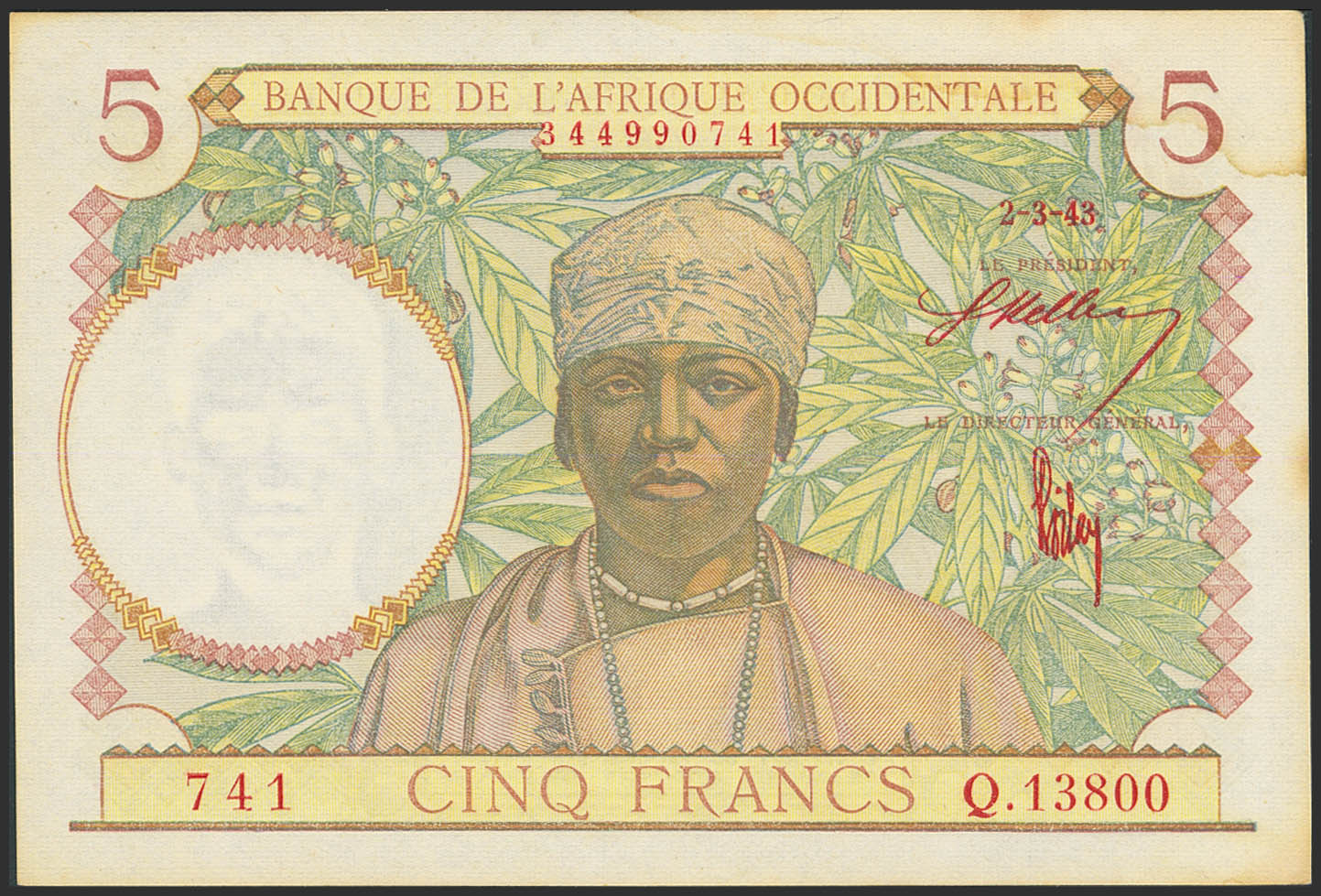FRENCH WEST AFRICA. 5 French. 2 March 1943. Banque de l'Afrique Occidentale. (Pick: 26). Rust on edges and corners. Less than Uncirculated.