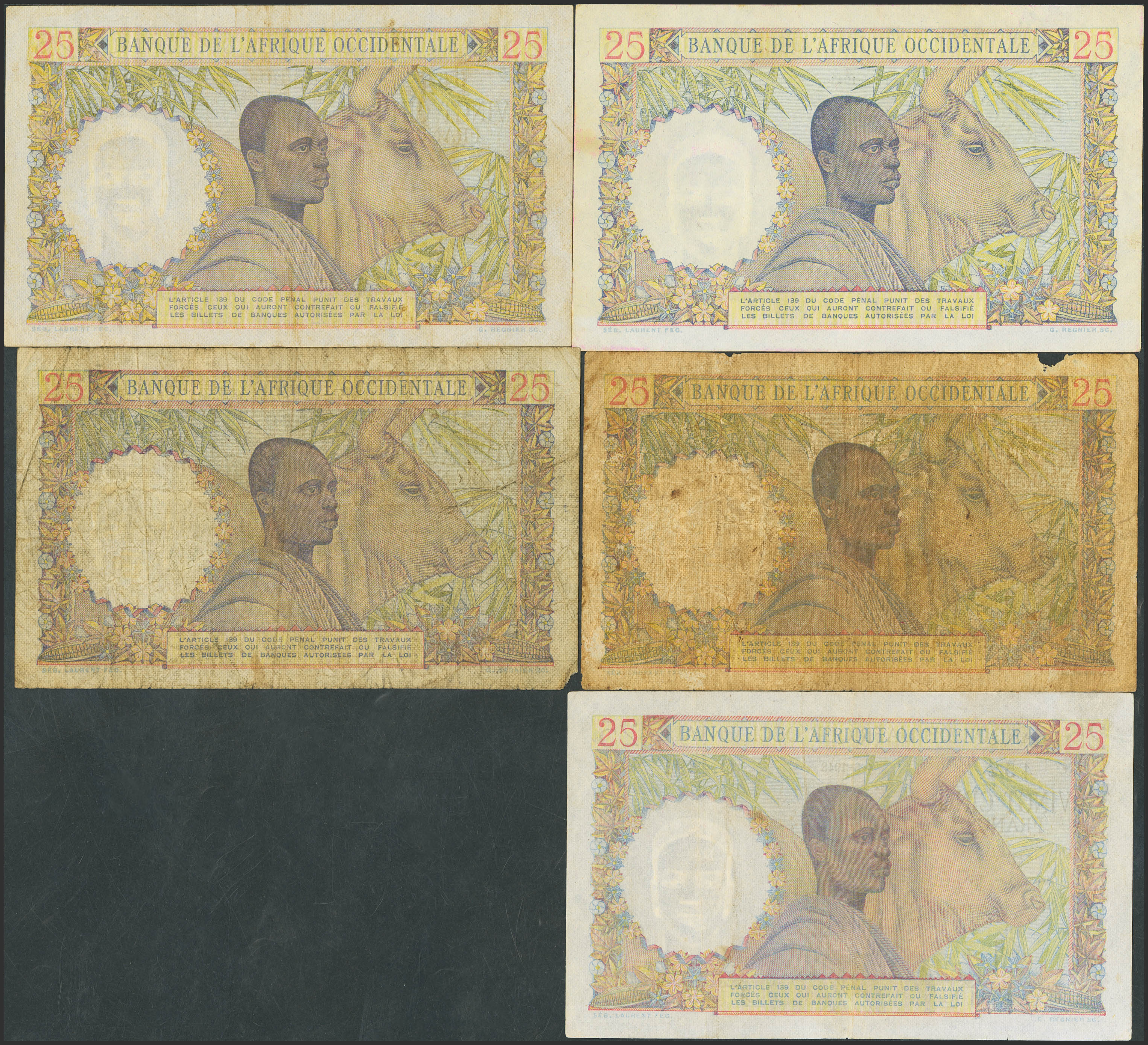 FRENCH WEST AFRICA. Lot of 5 notes of 25 Francs. 1943 to 1948. Banque de l'Afrique Occidentale. (Pick: 38). Fine (2), More than Very Fine (2) and More than Extremely Fine (1).