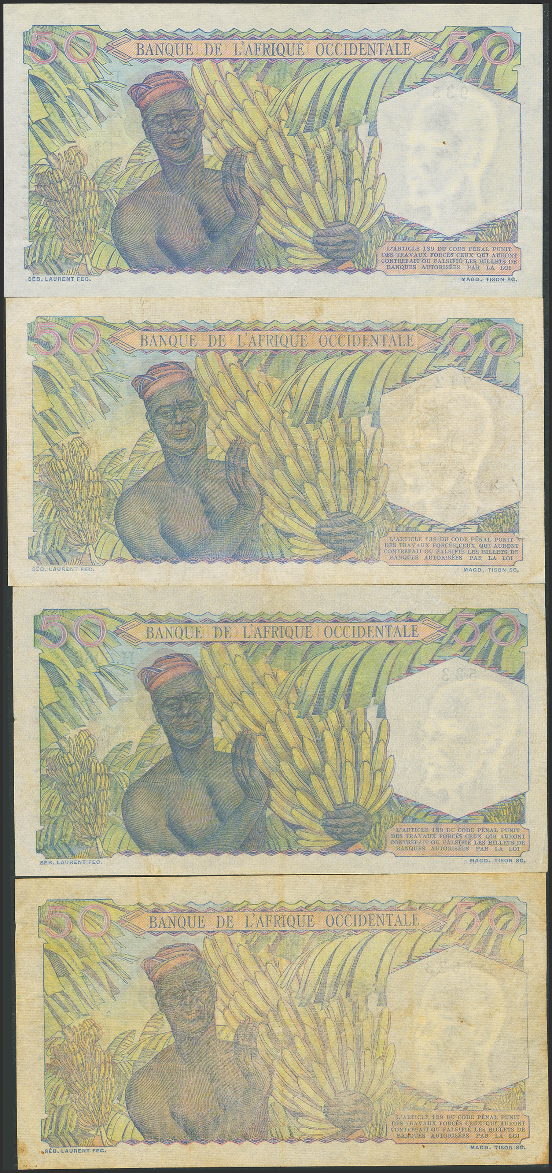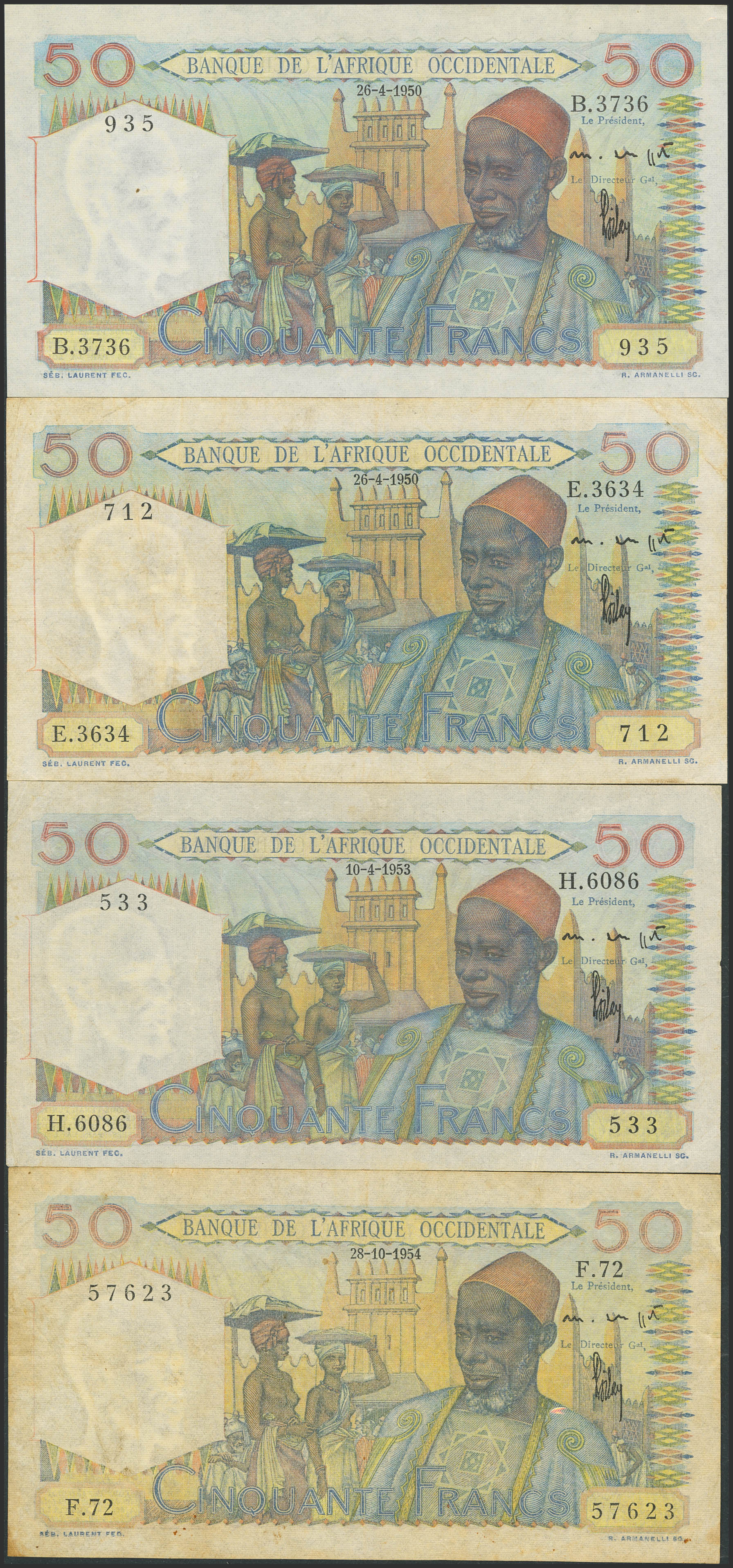 FRENCH WEST AFRICA. Lot of 4 notes of 50 Francs. 1950 to 1954. Banque de l'Afrique Occidentale. (Pick: 39). Very Fine (1), More than Very Fine (2) and Extremely Fine (2).