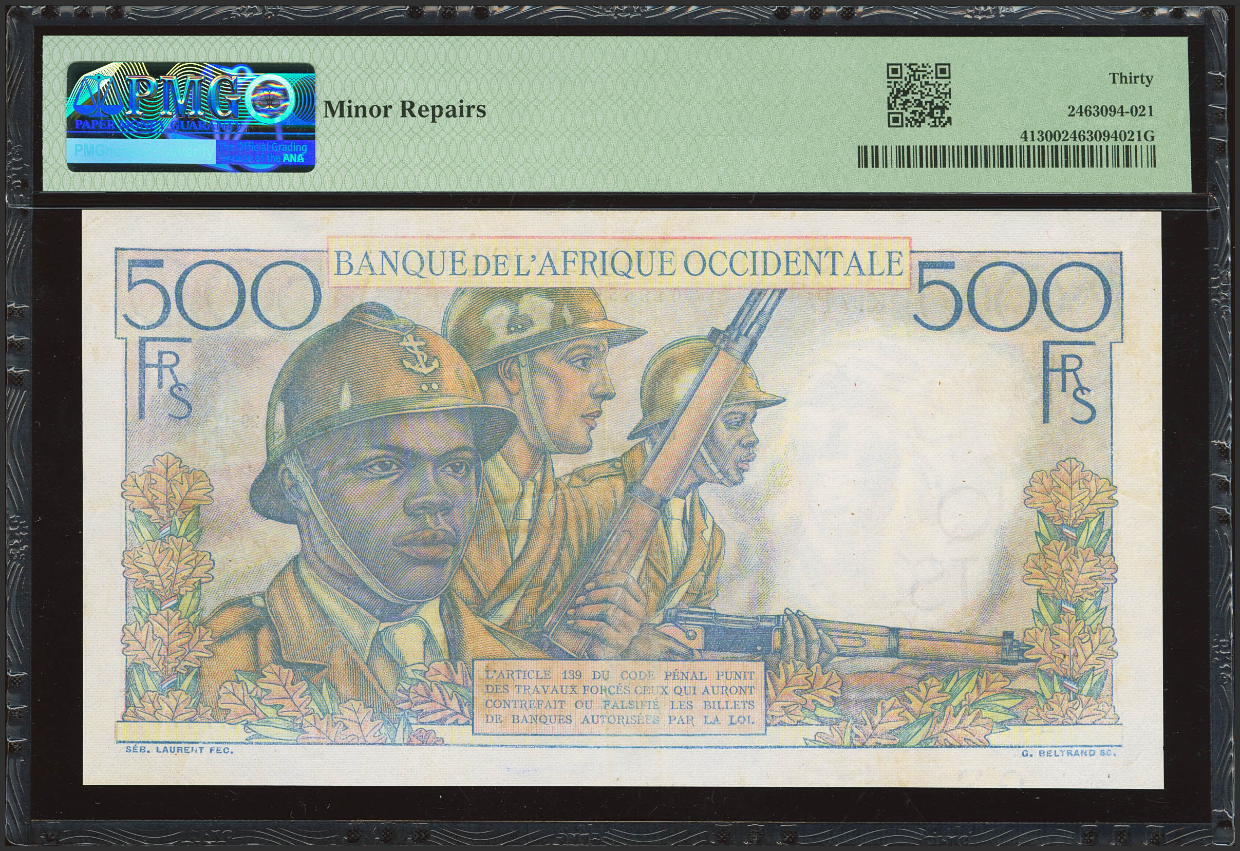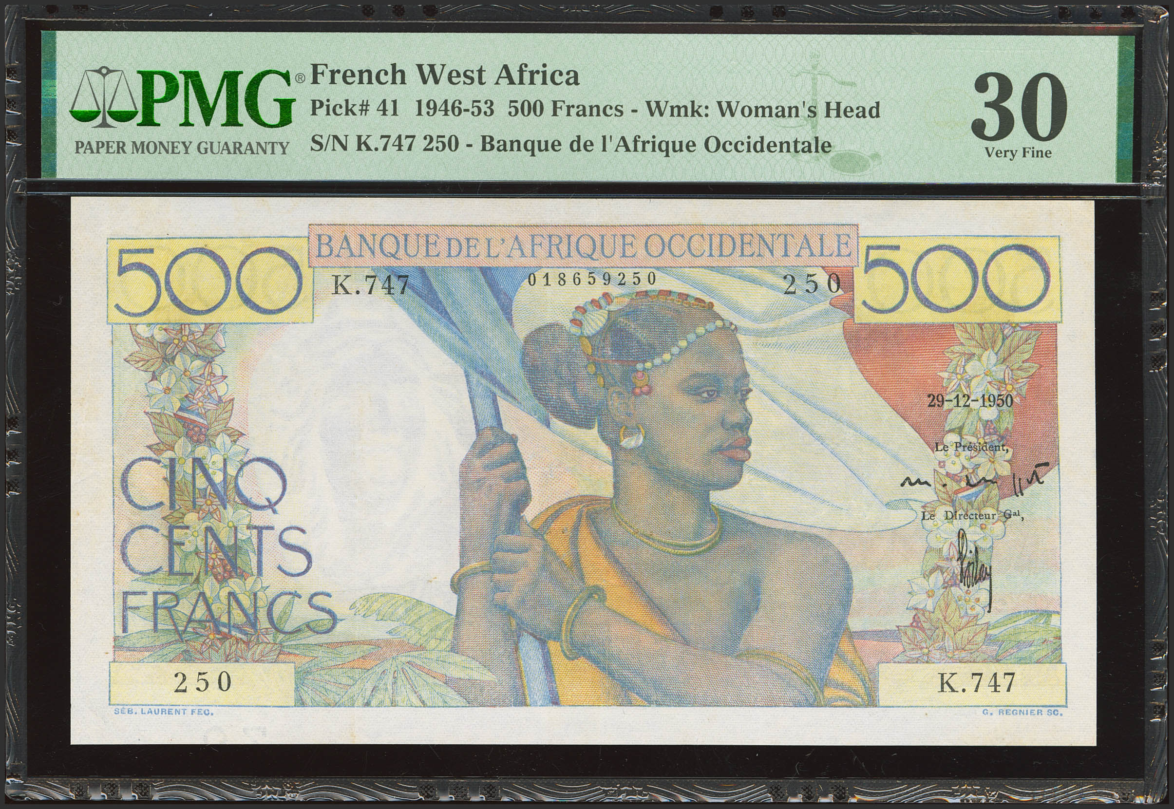English FRENCH WEST AFRICA. 500 Francs. 29 December 1950. Banque de l'Afrique Occidentale. Signatures of Coppett and Poilay. (Pick: 41). PMG30 (minor repairs).