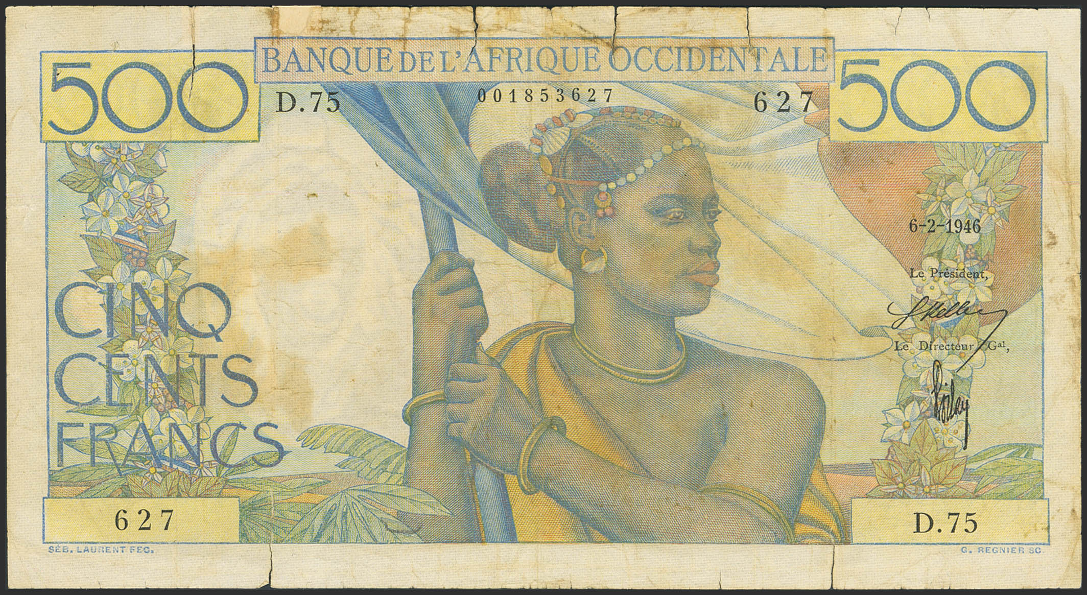 English FRENCH WEST AFRICA. 500 Francs. 6 February 1946. Banque de l'Afrique Occidentale. Signatures of Keller and Poilay. (Pick: 41). Tears, adhesive paper added over a nick. Fine.