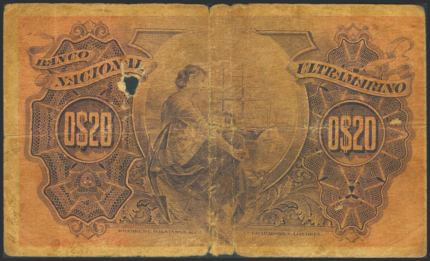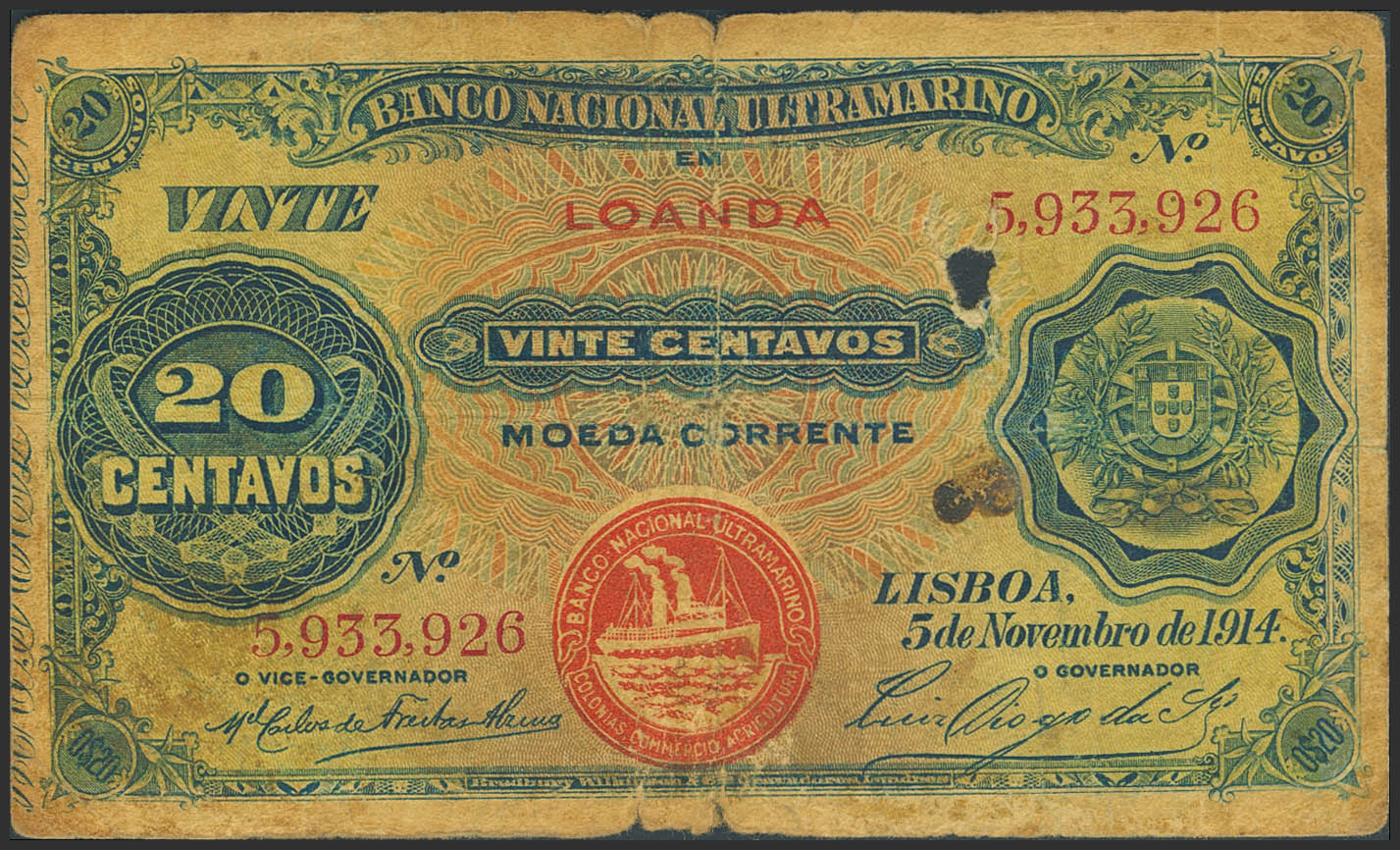 ANGOLA. 20 Cents. November 5, 1914. Banco Nacional Ultramarino. (Pick: 43). Hole, tears. Fine.