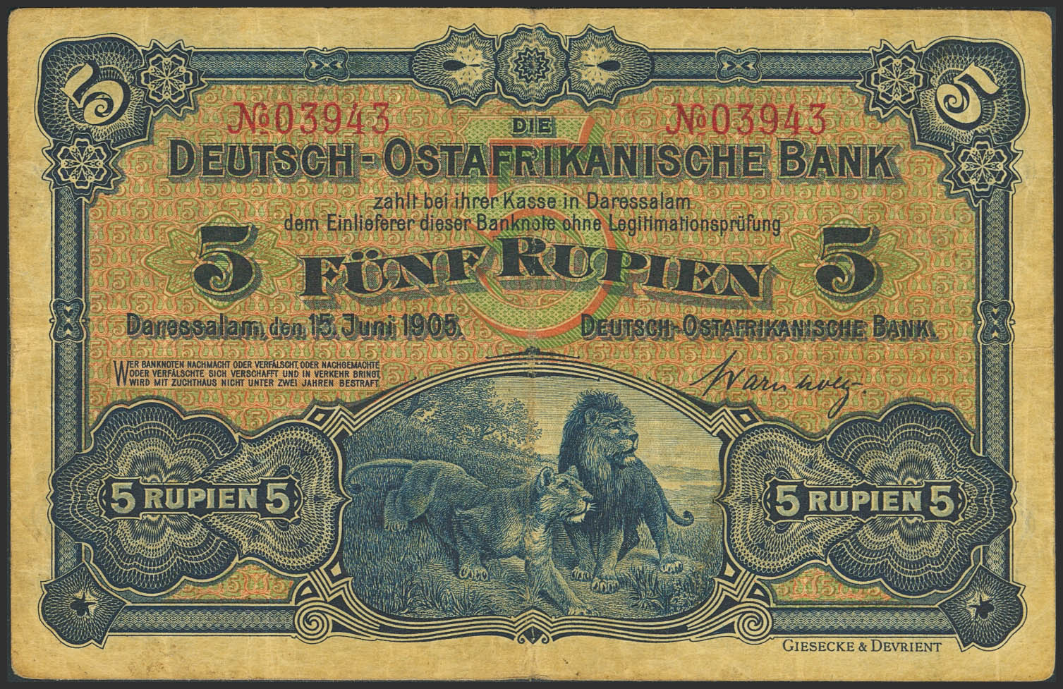 GERMAN EAST AFRICA. 5 Rupien. June 15, 1905. Deutsch-Ostafrikanische Bank. (Pick: 1). Very Fine.