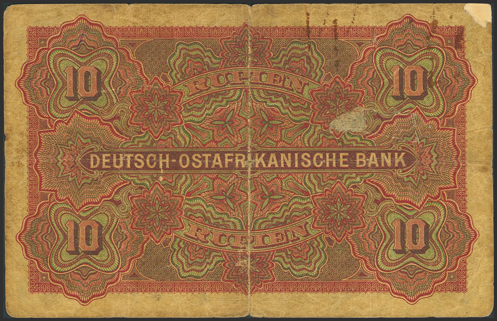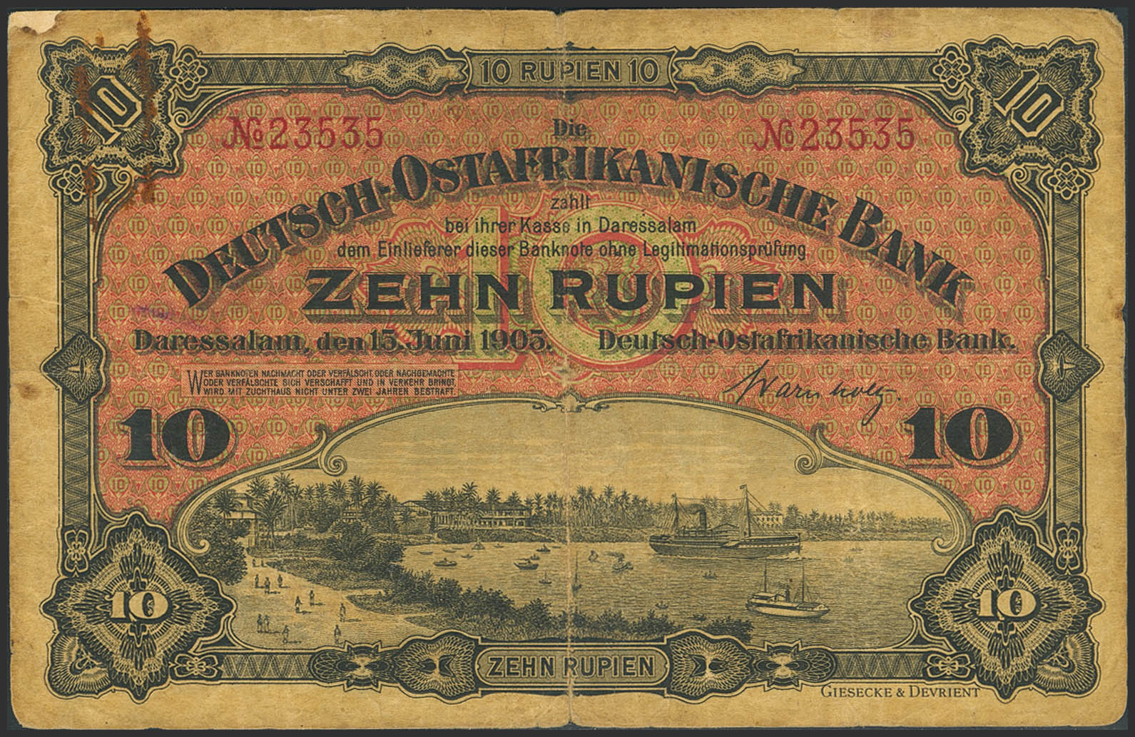 English GERMAN EAST AFRICA. 10 Rupeen. June 15, 1905. Deutsch-Ostafrikanische Bank. (Pick: 2). Adhesive paper added on missing corner. More than Fine.