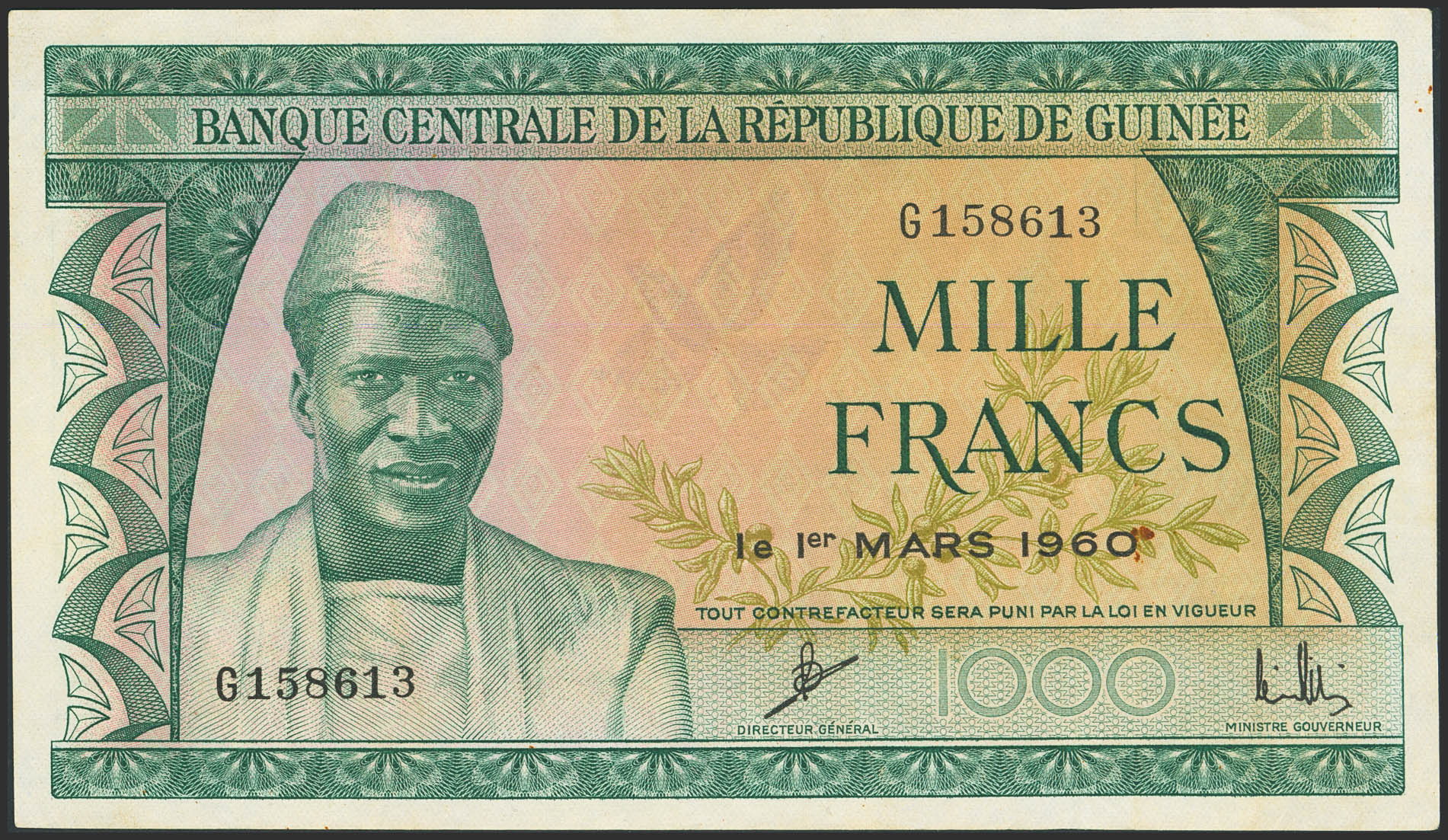 GUINEA. 1000 Francs. 1 March 1960. Banque de la Republique. (Pick: 15a). Flattened. More than Very Fine.