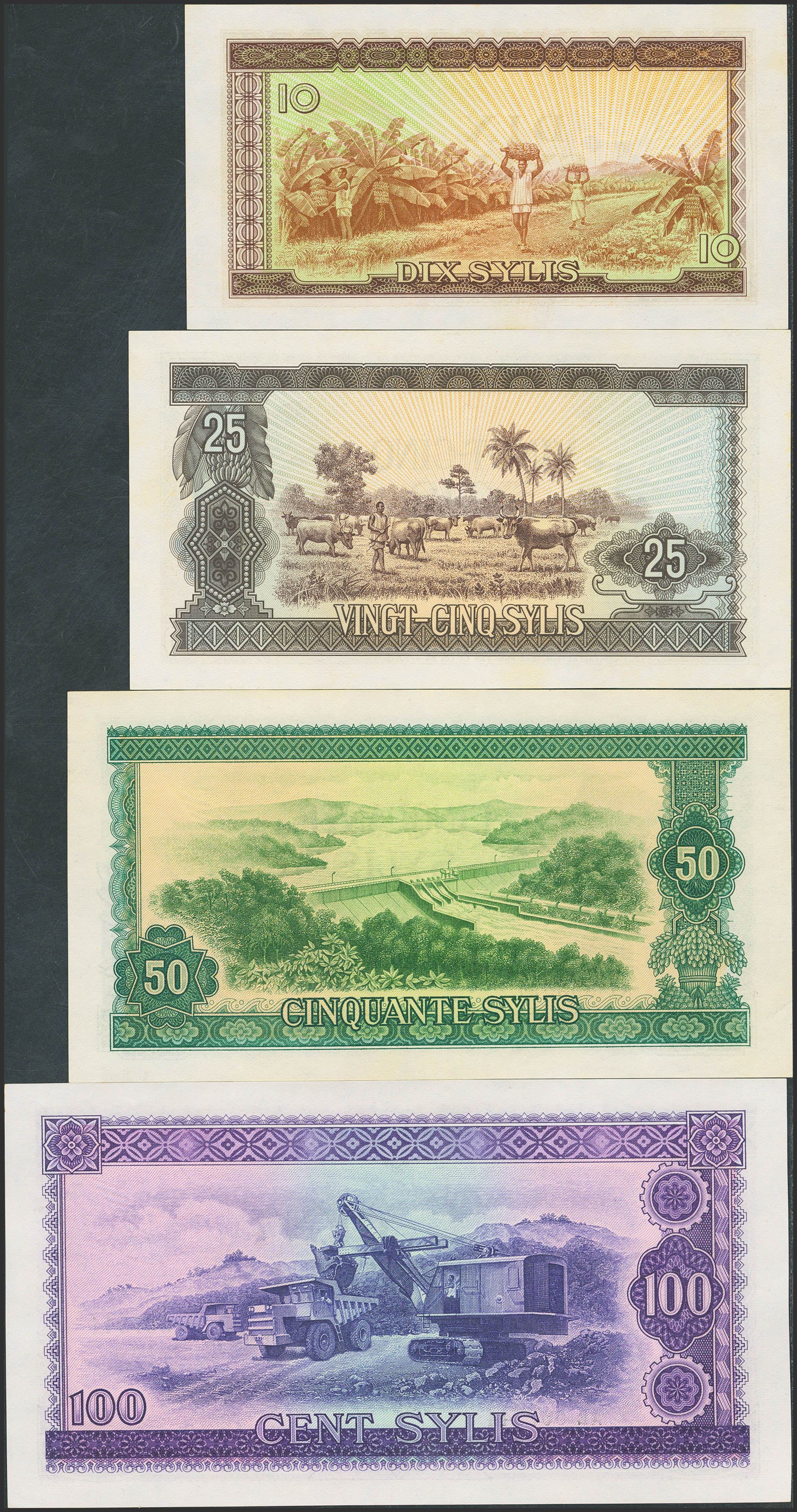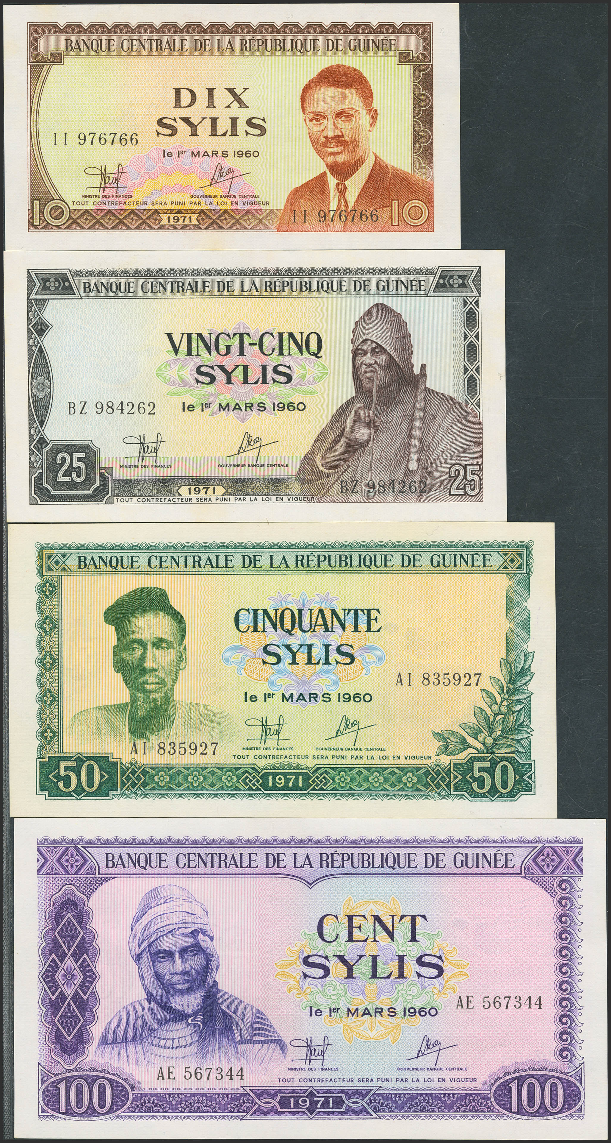 GUINEA. Complete set of 4 notes from 10 to 100 Sylis. 1971. Central Bank. (Pick: 16, 17, 18, 19). Uncirculated (3) and Extremely Fine (P18).