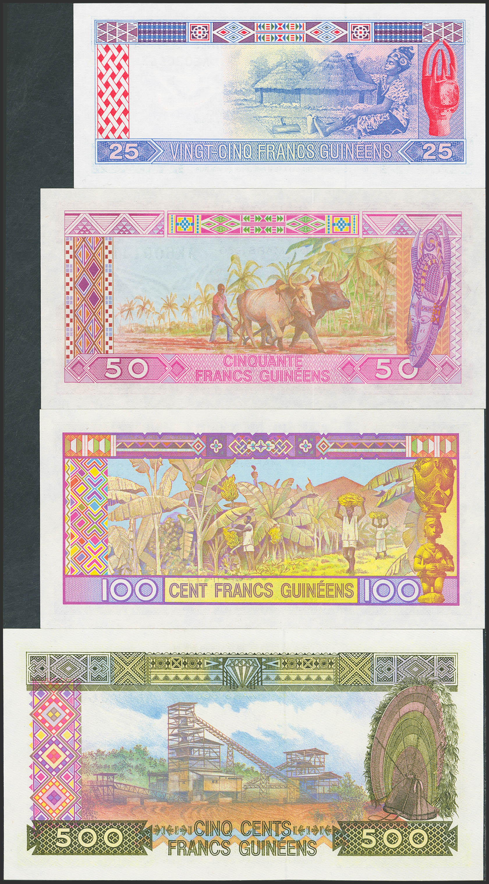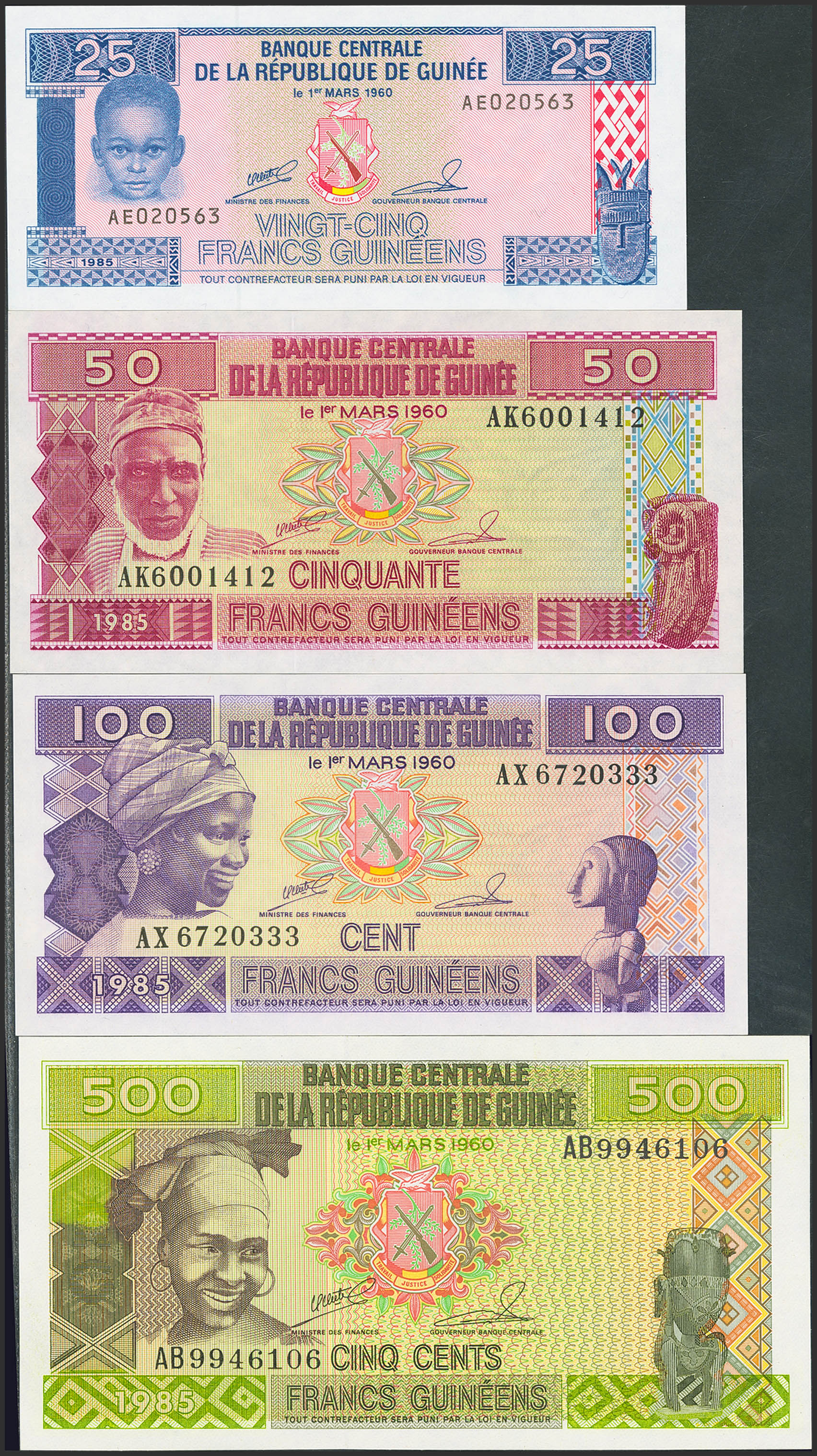 GUINEA. Lot of 4 notes from 25 to 500 Francs. 1985. Central Bank. (Pick: 28a, 29a, 30a, 31a). Uncirculated.