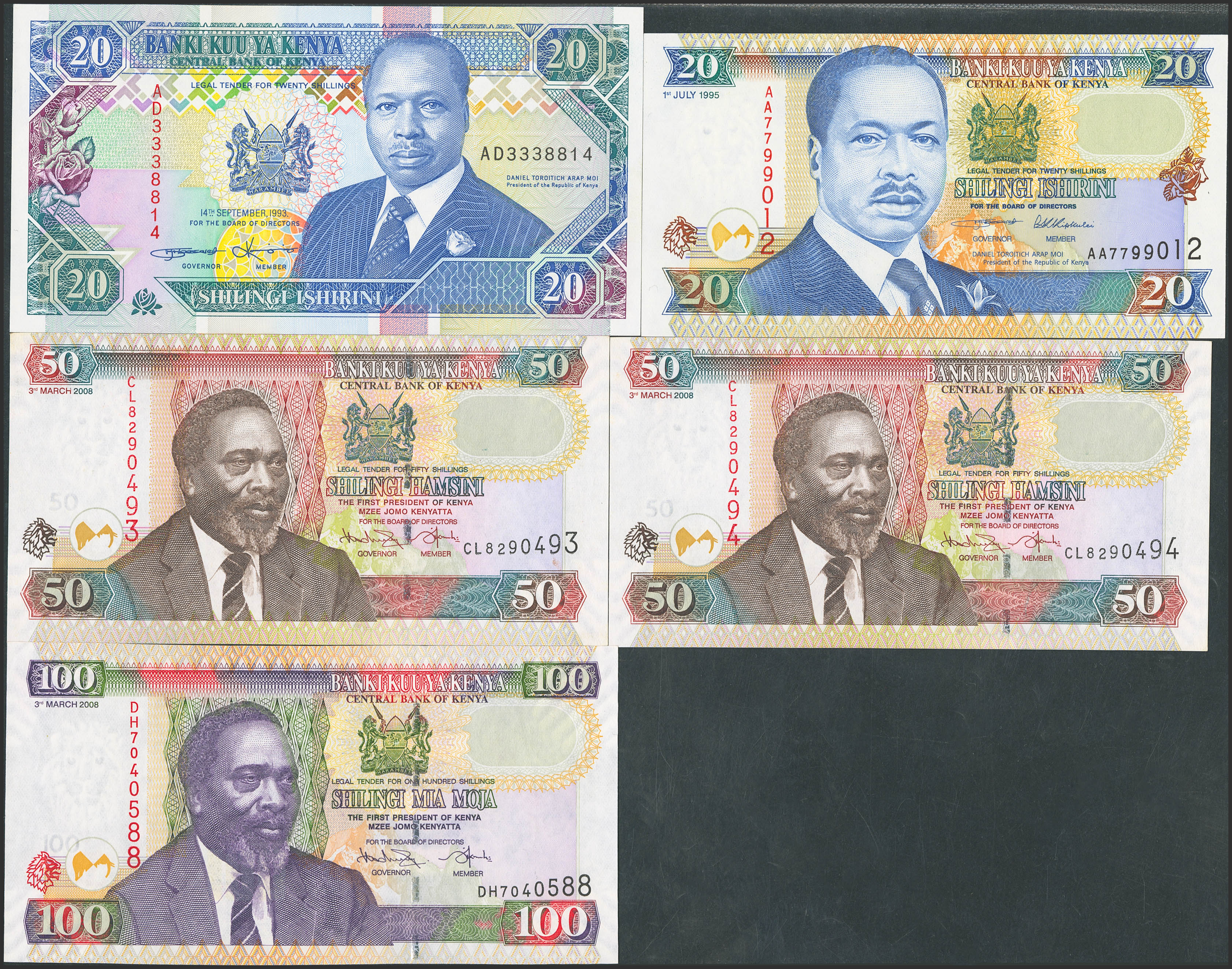 English KENYA. Lot of 5 notes from 20 to 100 Shillings. 1993 to 2008. Central Bank. (Pick: 31a, 32, 47c(2), 48c). Uncirculated.