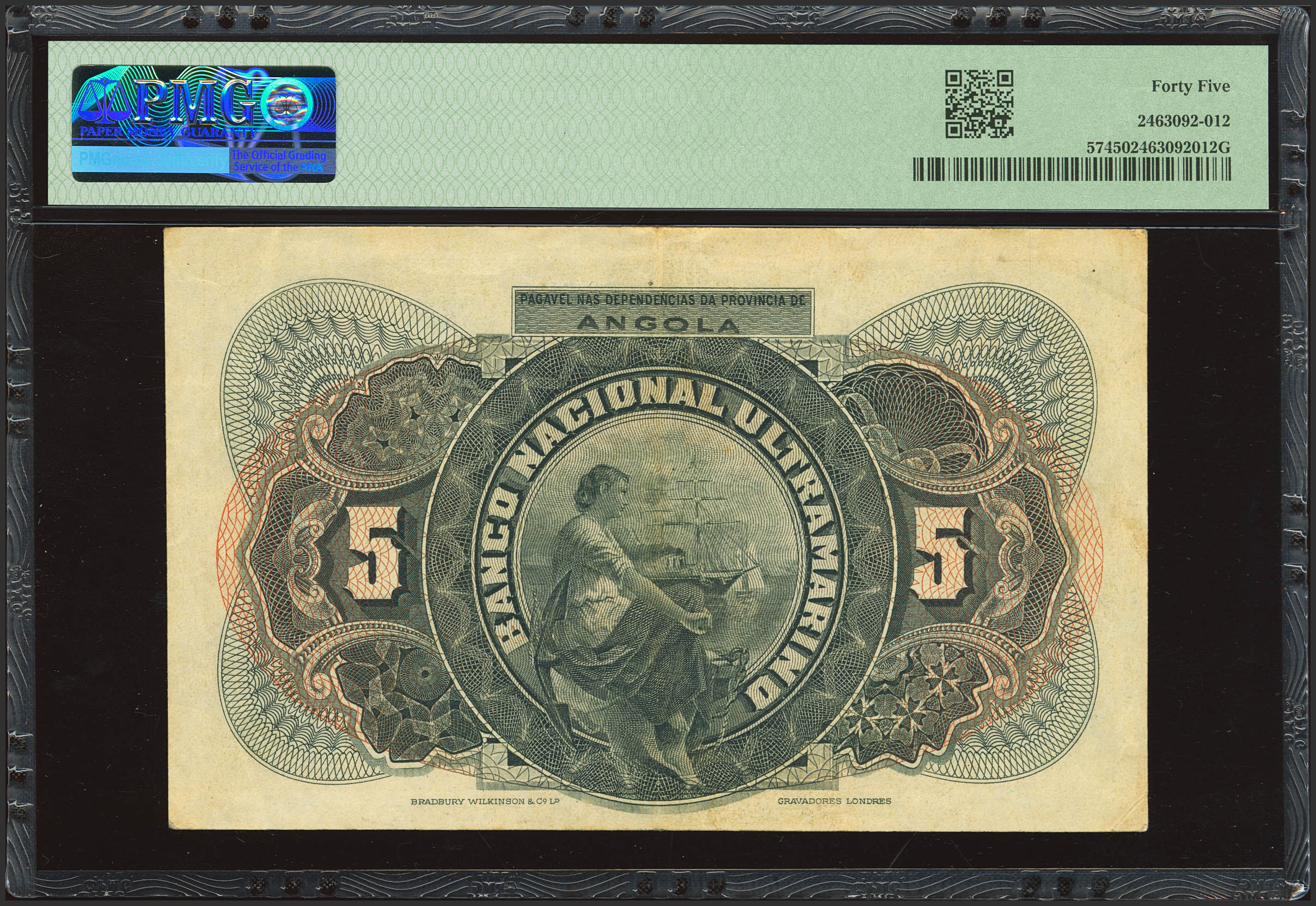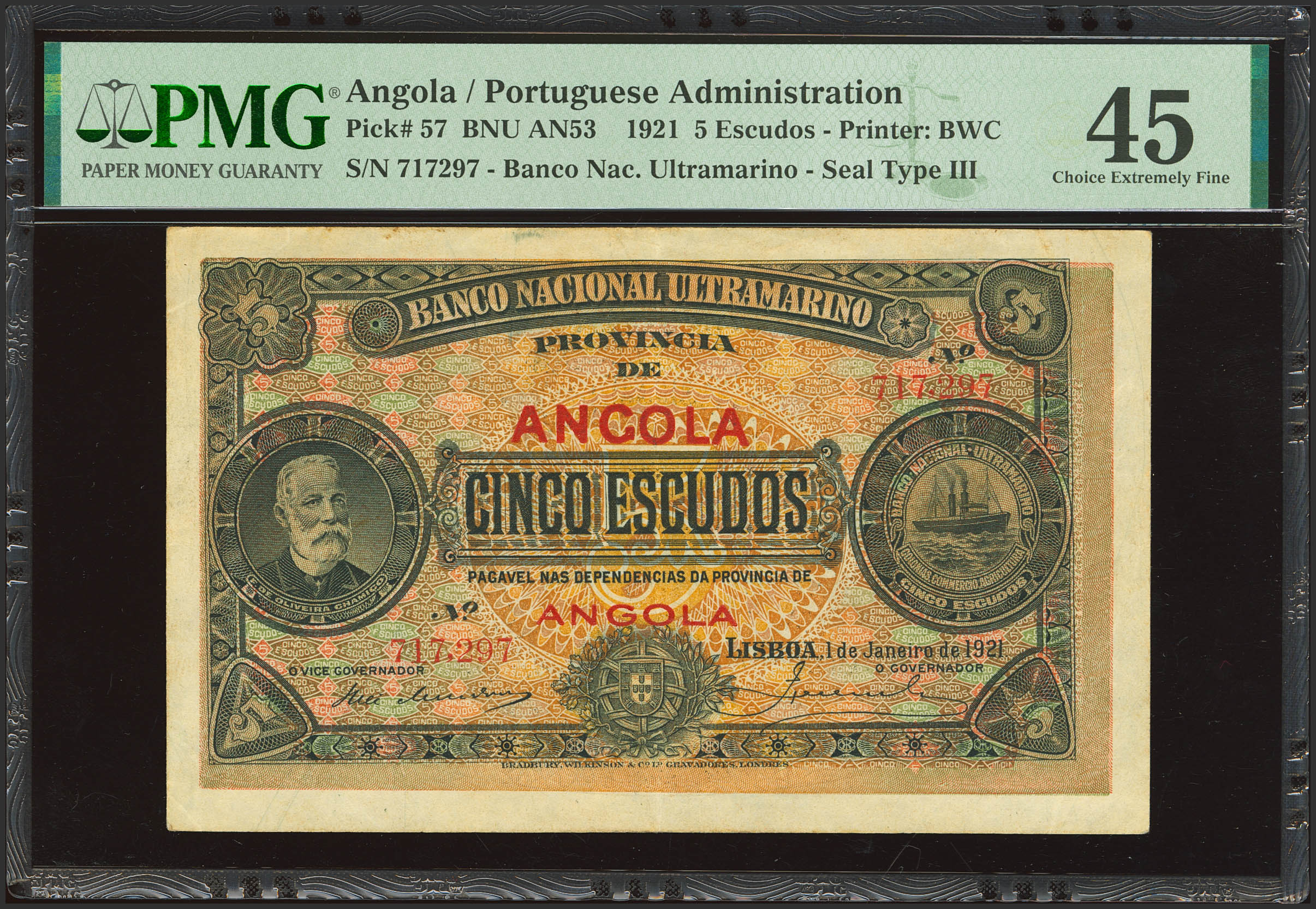 ANGOLA. 5 Shields. January 1, 1921. Banco Nacional Ultramarino. (Pick: 57). PMG45.
