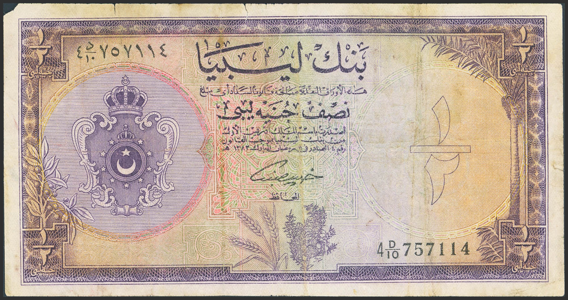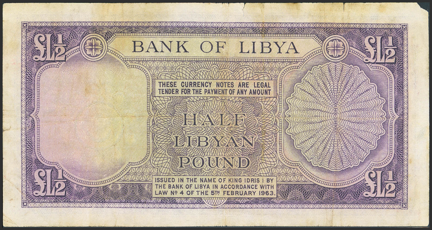English LIBYA. ½ Libyan Pound. 5 February 1963. Bank of Libya. (Pick: 24). Flattened, corner missing, tears. Very Fine.