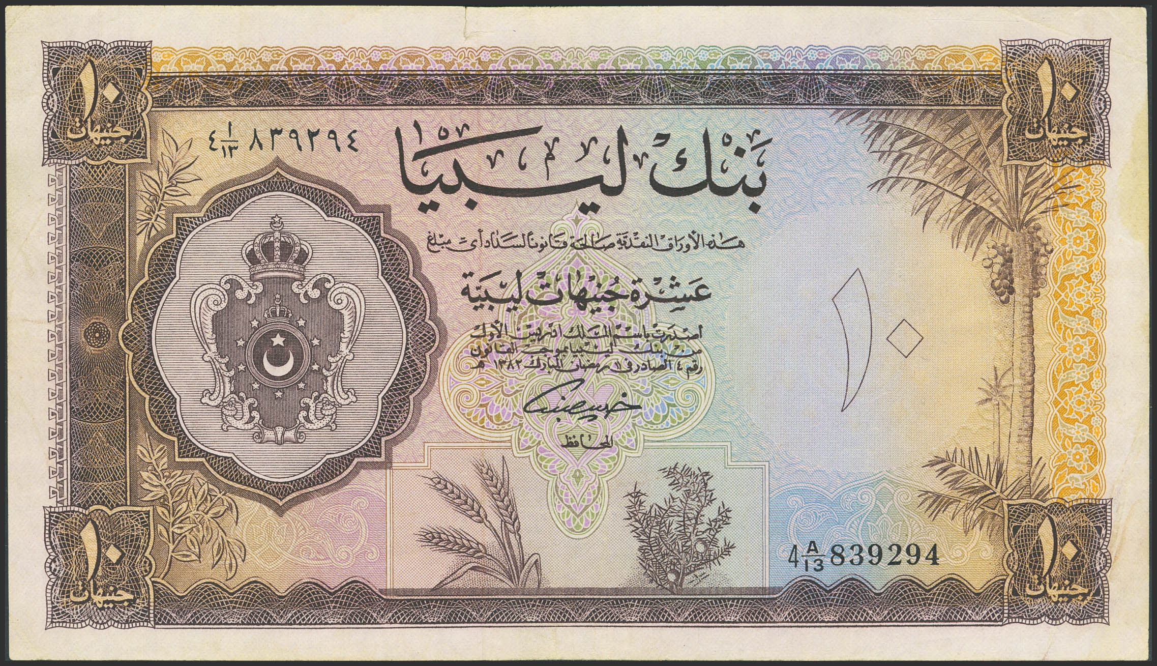 LIBYA. 10 Libyan Pounds. 5 February 1963. Bank of Libya. (Pick: 27). More than Very Fine.