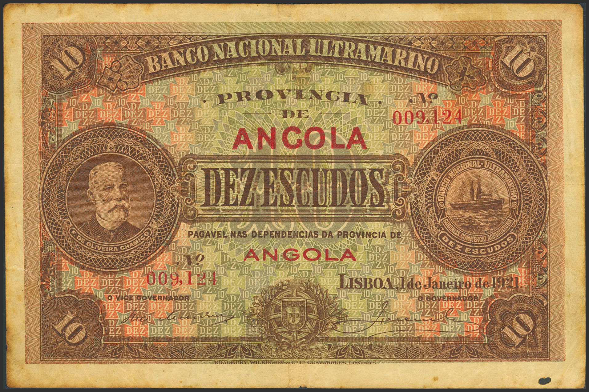 ANGOLA. 10 Shields. January 1, 1921. Banco Nacional Ultramarino. (Pick: 58). Wormhole on lower edge. Very Fine.