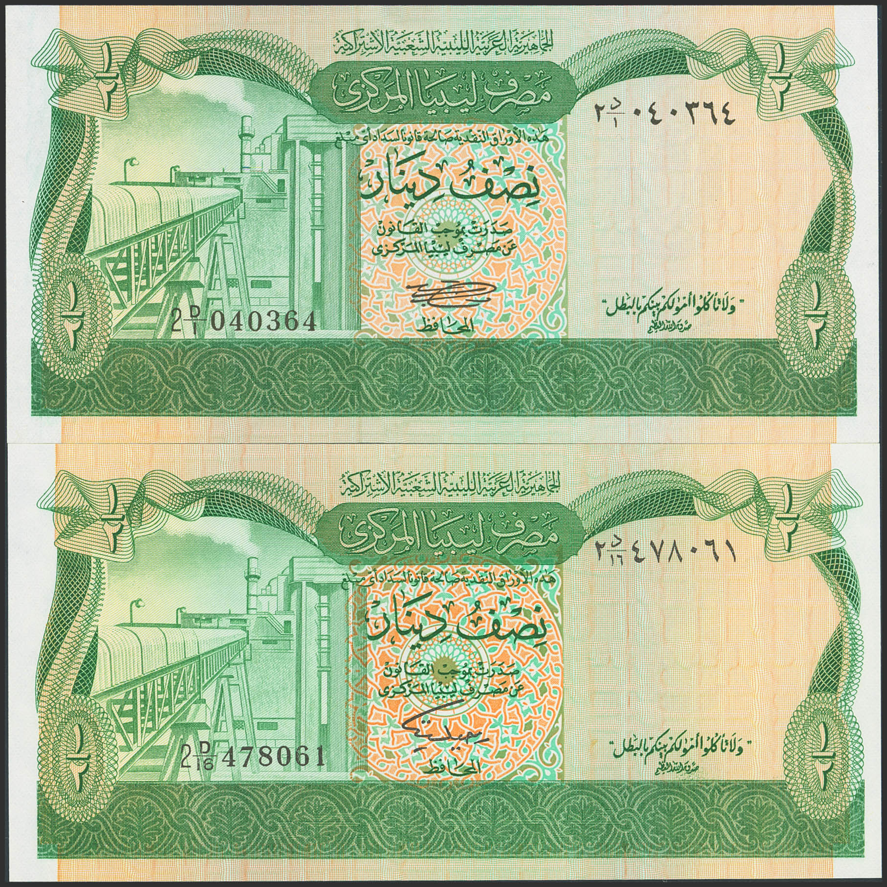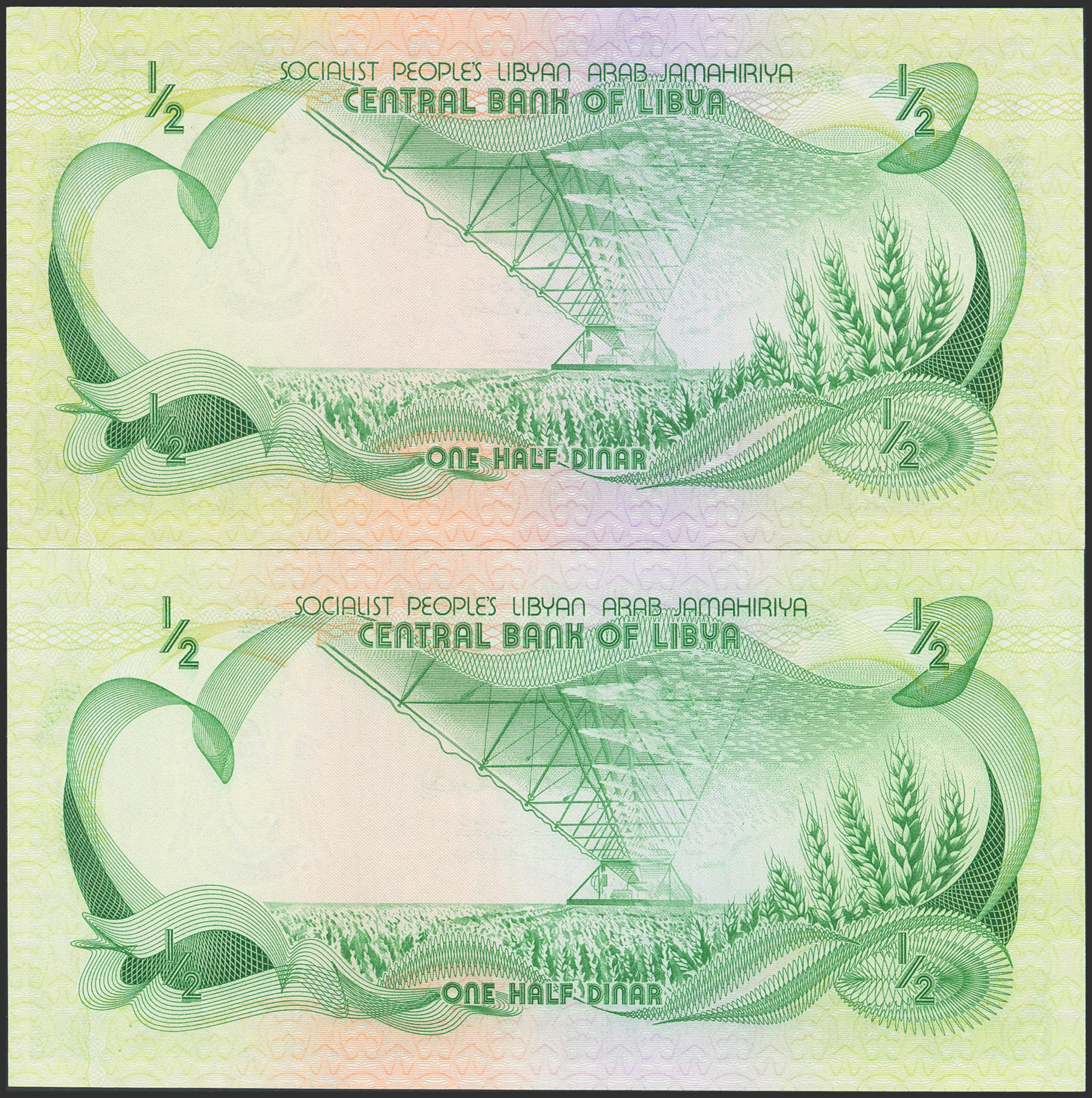 LIBYA. Lot of 2 notes of ½ Dinar. (1981ca). Central Bank. (Pick: 43a, 43b). Uncirculated.