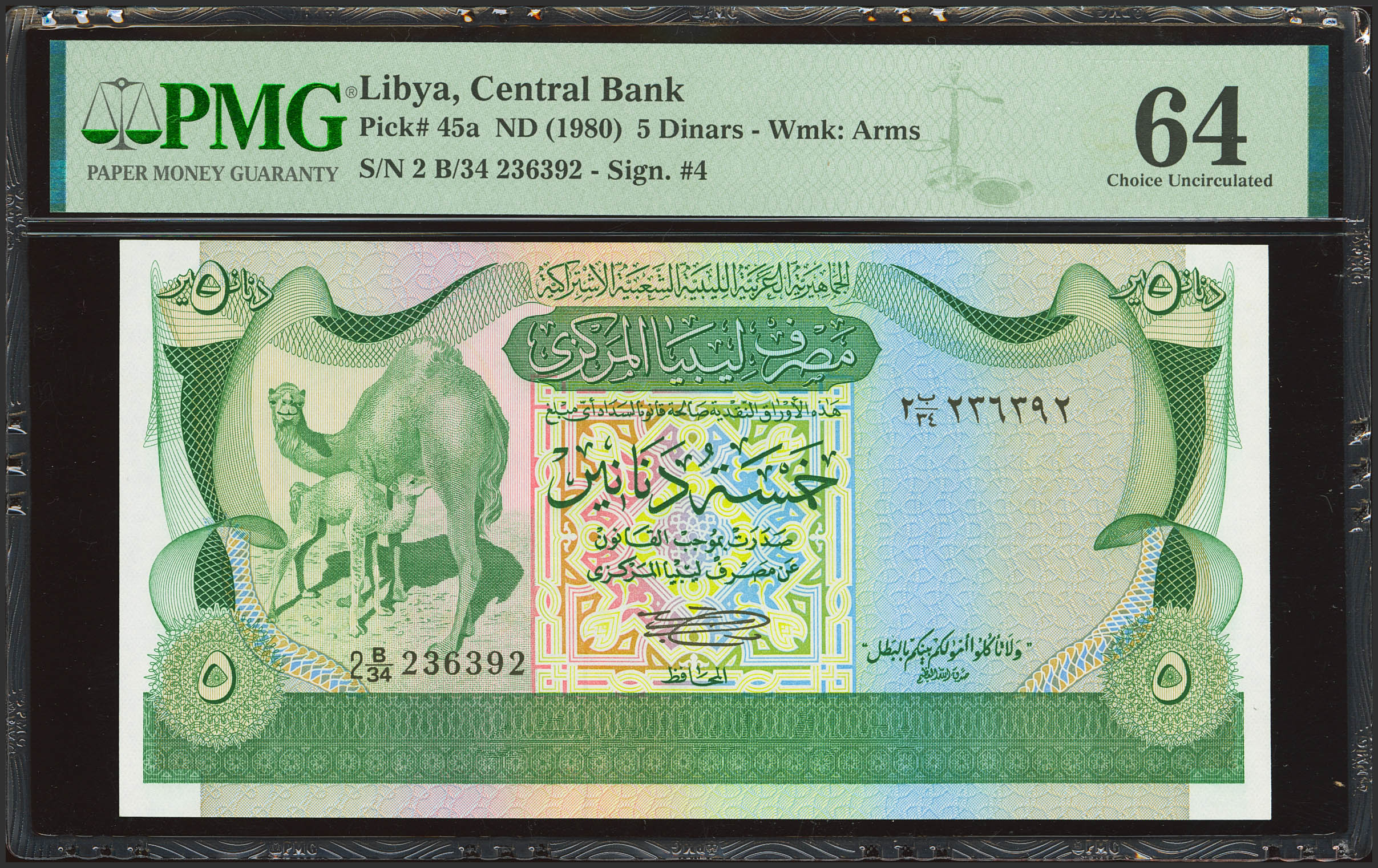 LIBYA. 5 Dinars. (1980ca). Central Bank. (Pick: 45a). PMG64.