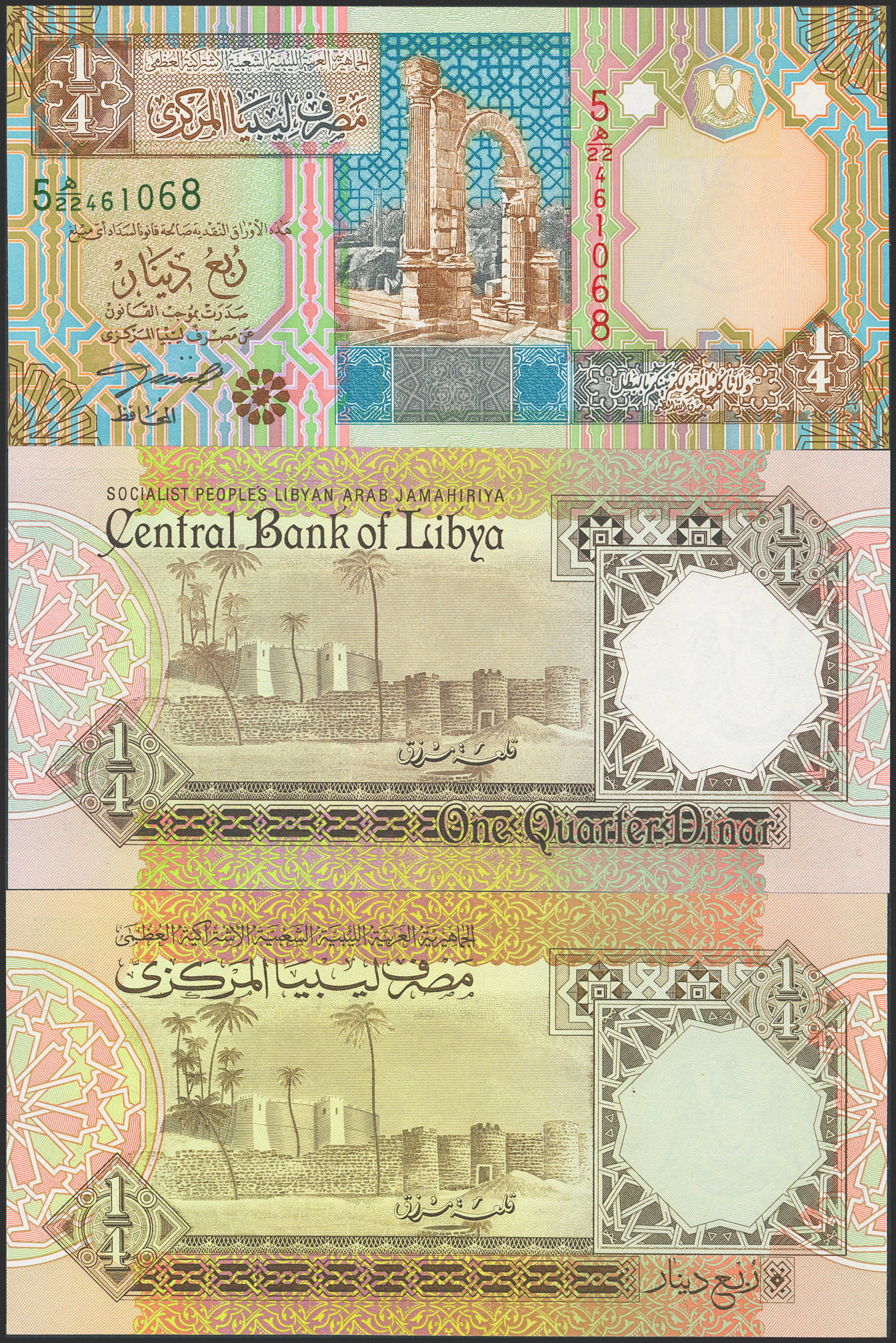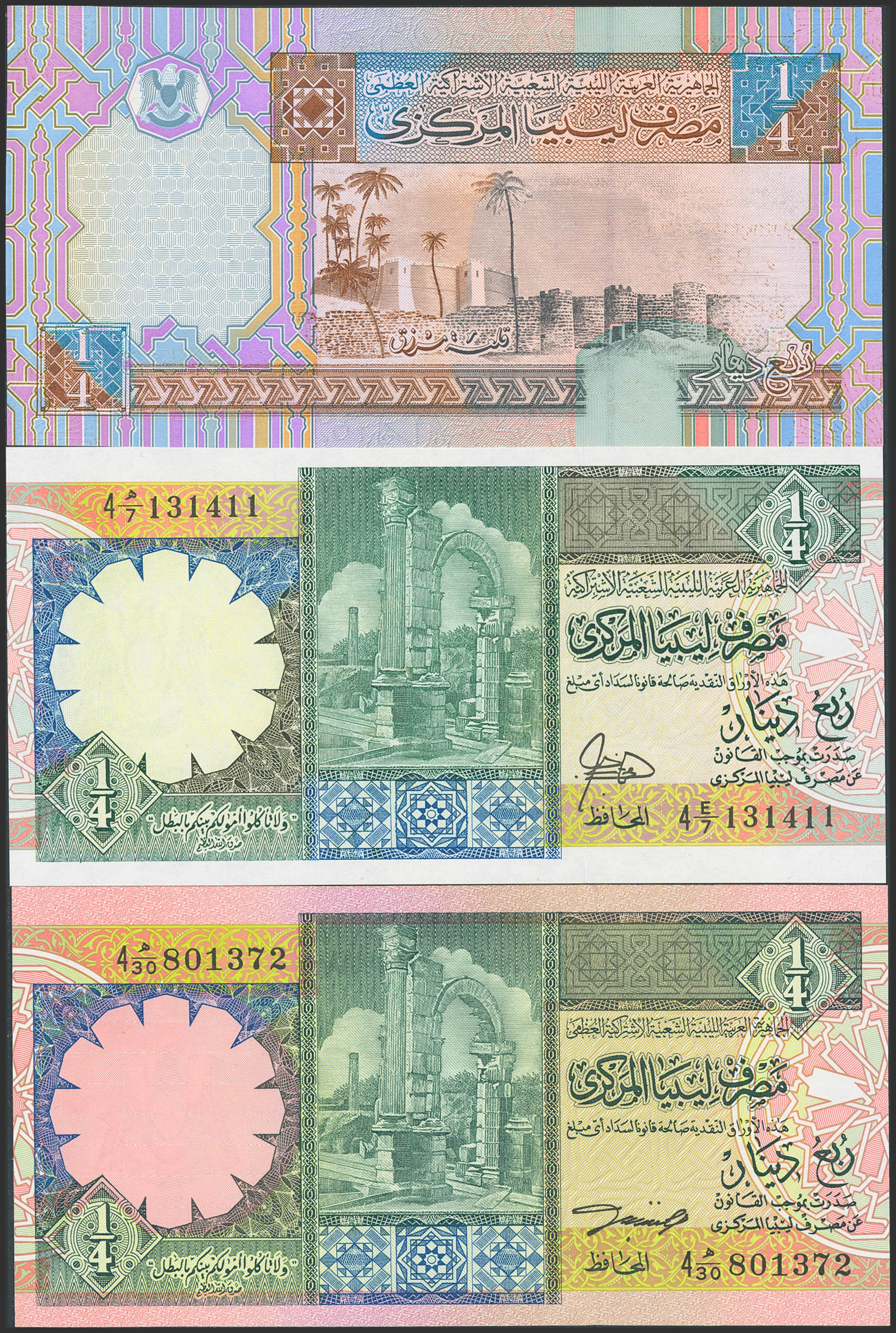 LIBYA. Lot of 3 notes of ¼ Dinar. 1988 to 2002. Central Bank. (Pick: 52, 57b, 62). Uncirculated.